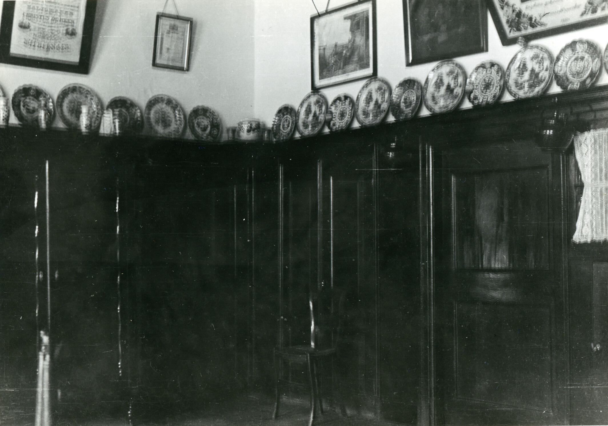 Het interieur van de woonkeuken in een boerderij in Haarlo. Op de richel langs de muur staan wandborden. Links, op de linnenkast, staan kastvazen. De foto is onscherp.