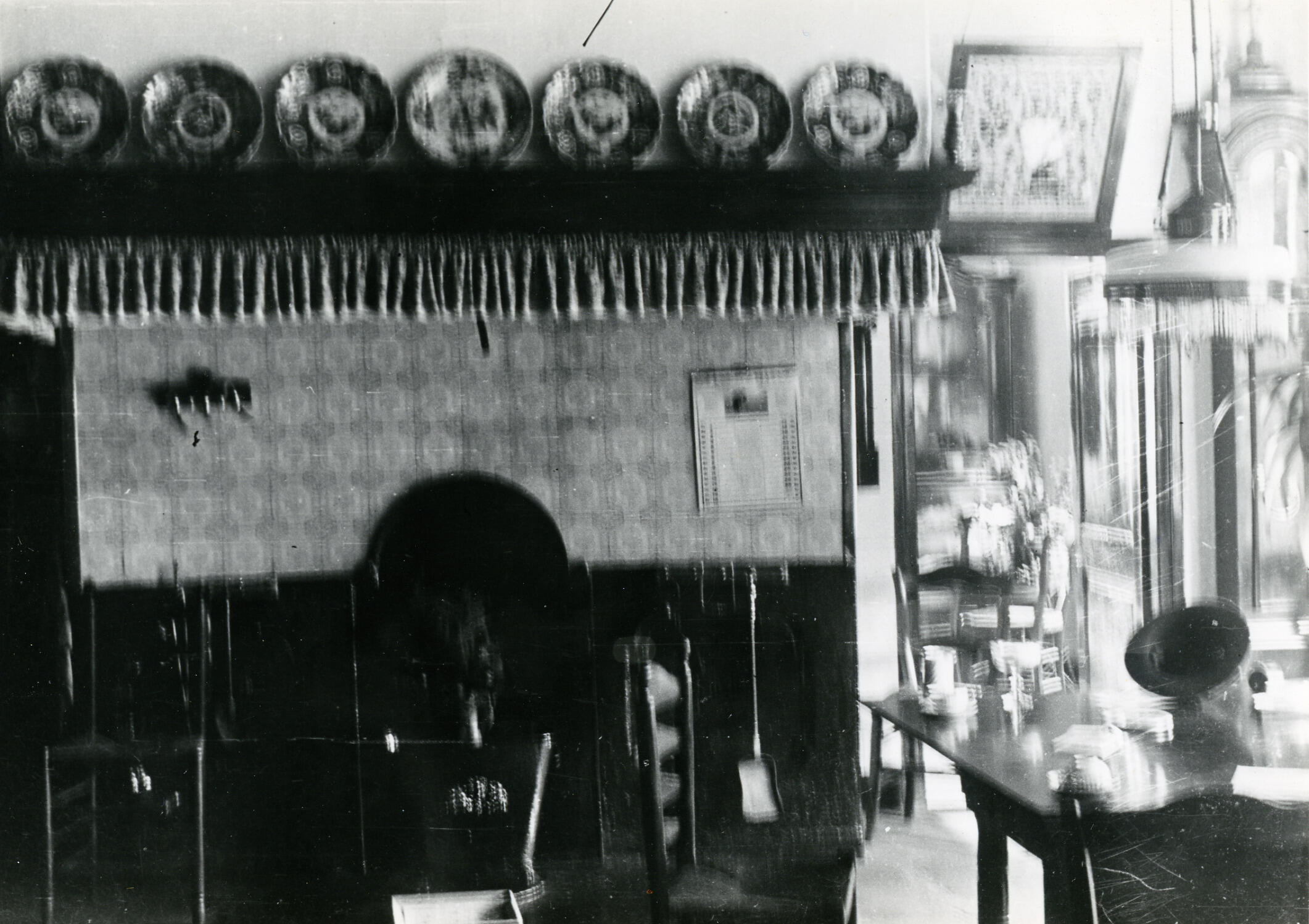 Het interieur van de woonkeuken van een boerderij in Haarlo. Links is de schoorsteenmantel met een schoorsteenval. Op de rand van de schoorsteenboezem staan wandborden. De foto is onscherp.