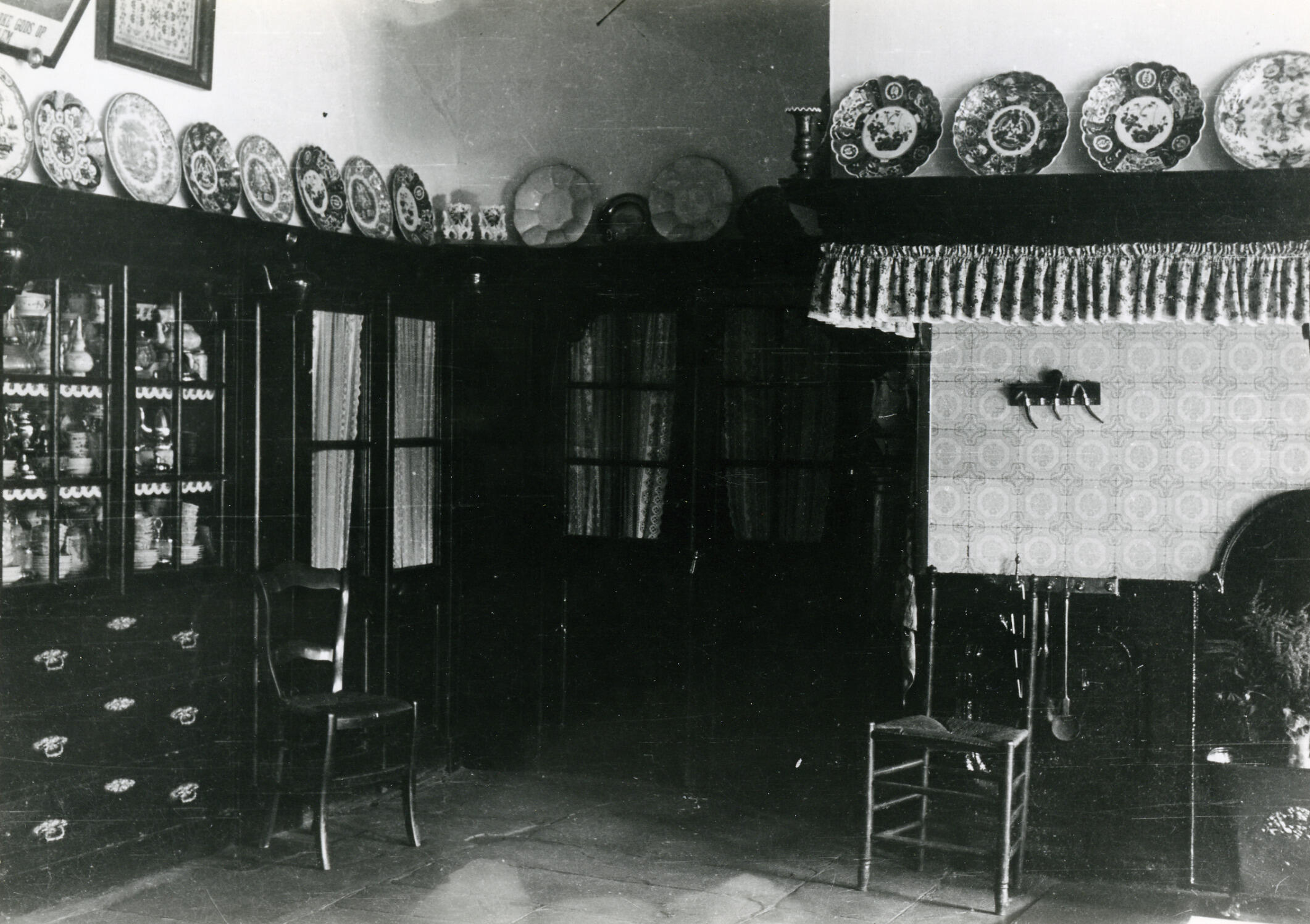 Het interieur van de woonkeuken van een boerderij in Haarlo. Rechts is een schoorsteenmantel met een schoorsteenval. Op de richel langs de muur en op de rand van de schoorsteenboezem staan wandborden.