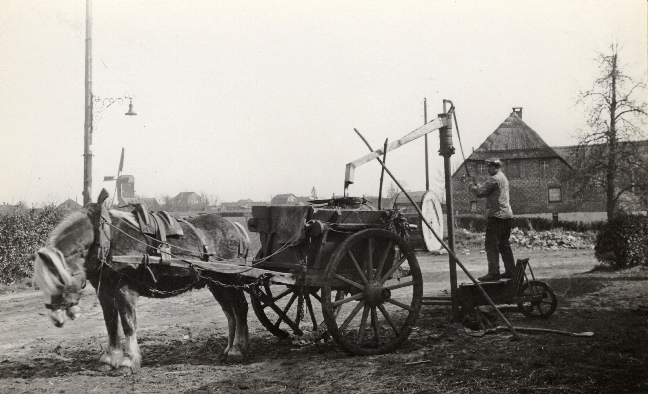 Een man in Deurne pompt een ondergrondse giertank leeg met een gierpomp. De gier wordt daarna met paard en wagen afgevoerd.