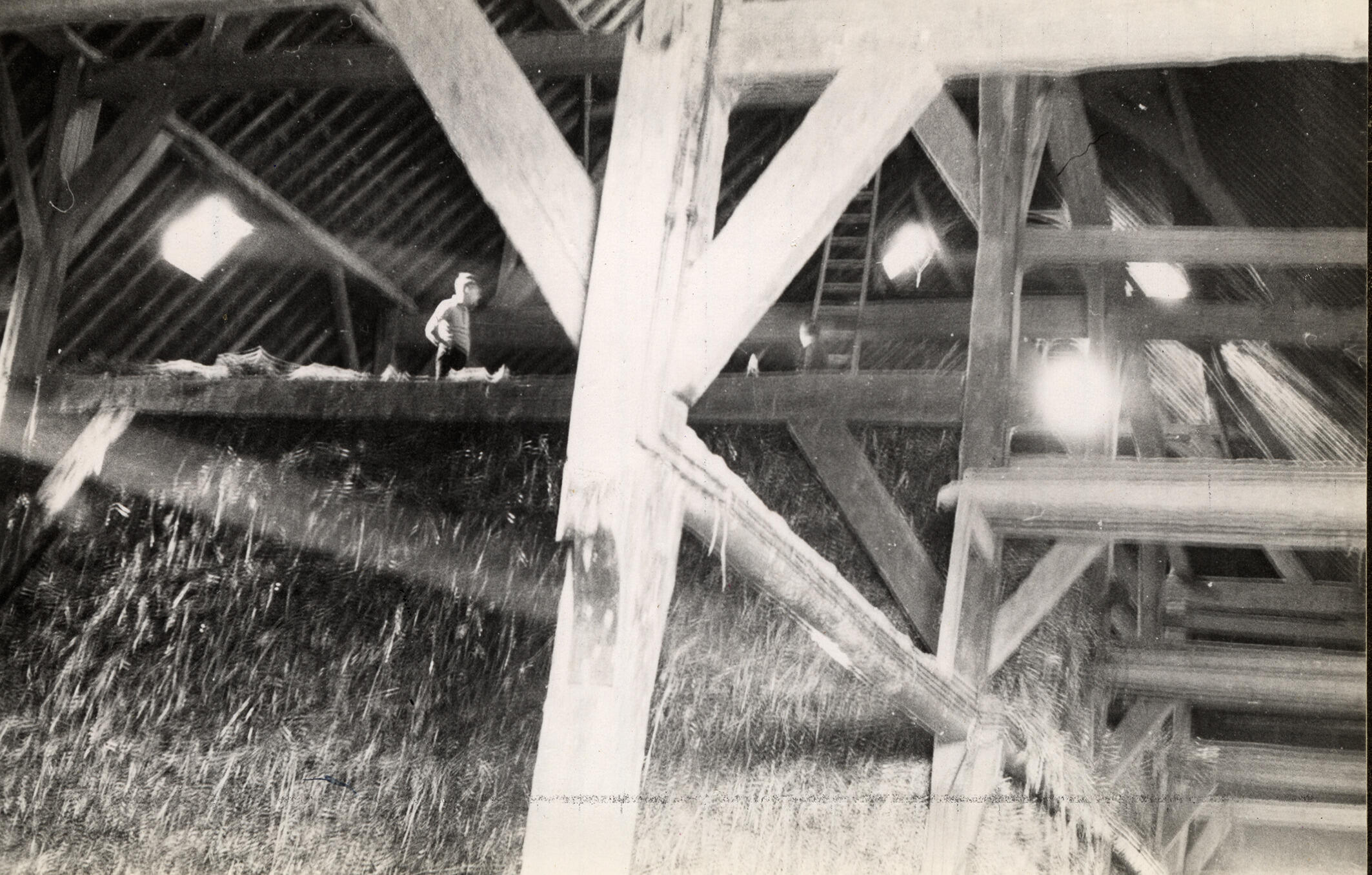 Houten gebinten van een boerderij in Numansdorp, met twee personen die op de hooizolder staan.