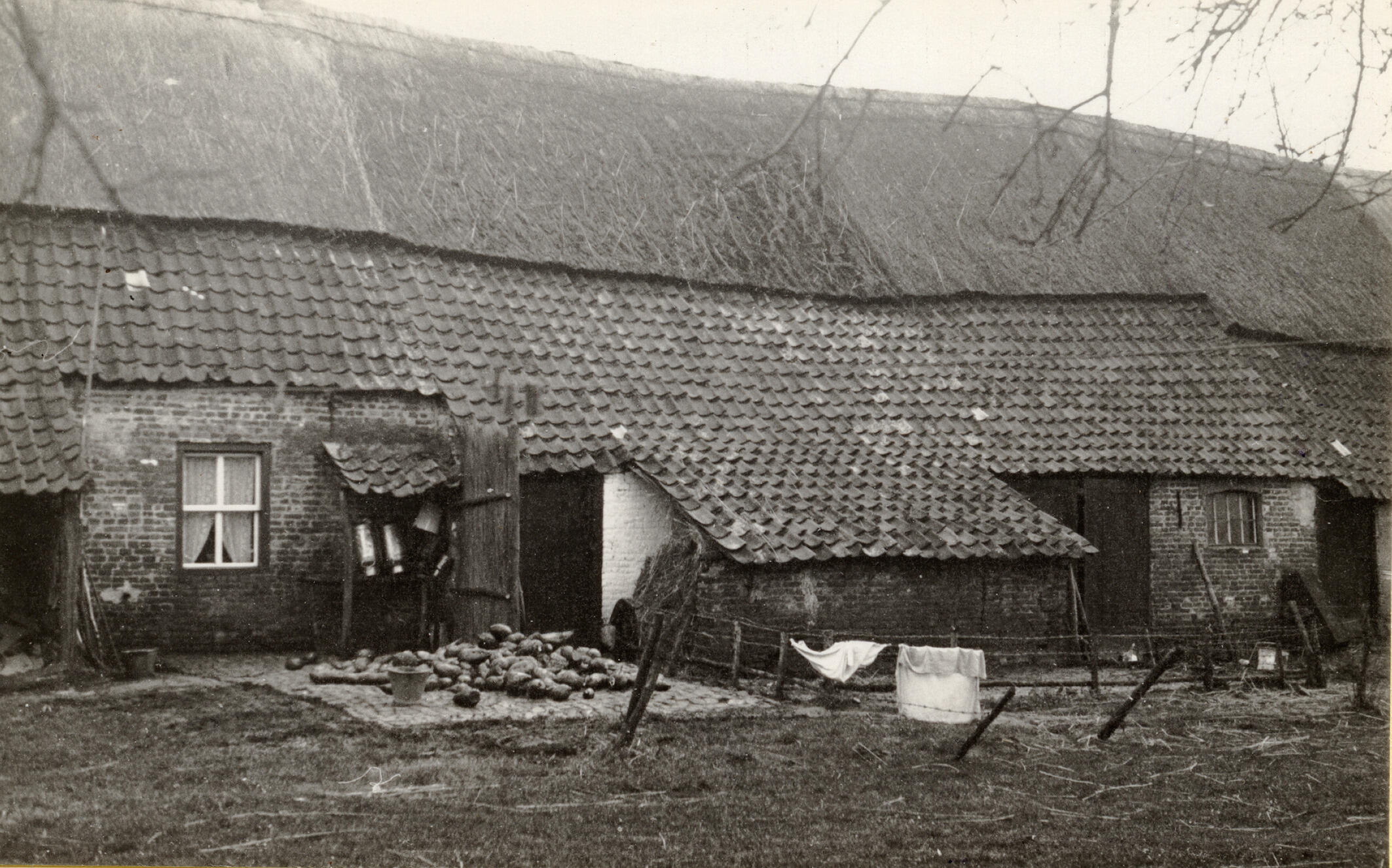 Zijgevel van een boerderij met spoelplaats, Brouwhuis, 1936 (zwart-wit foto)