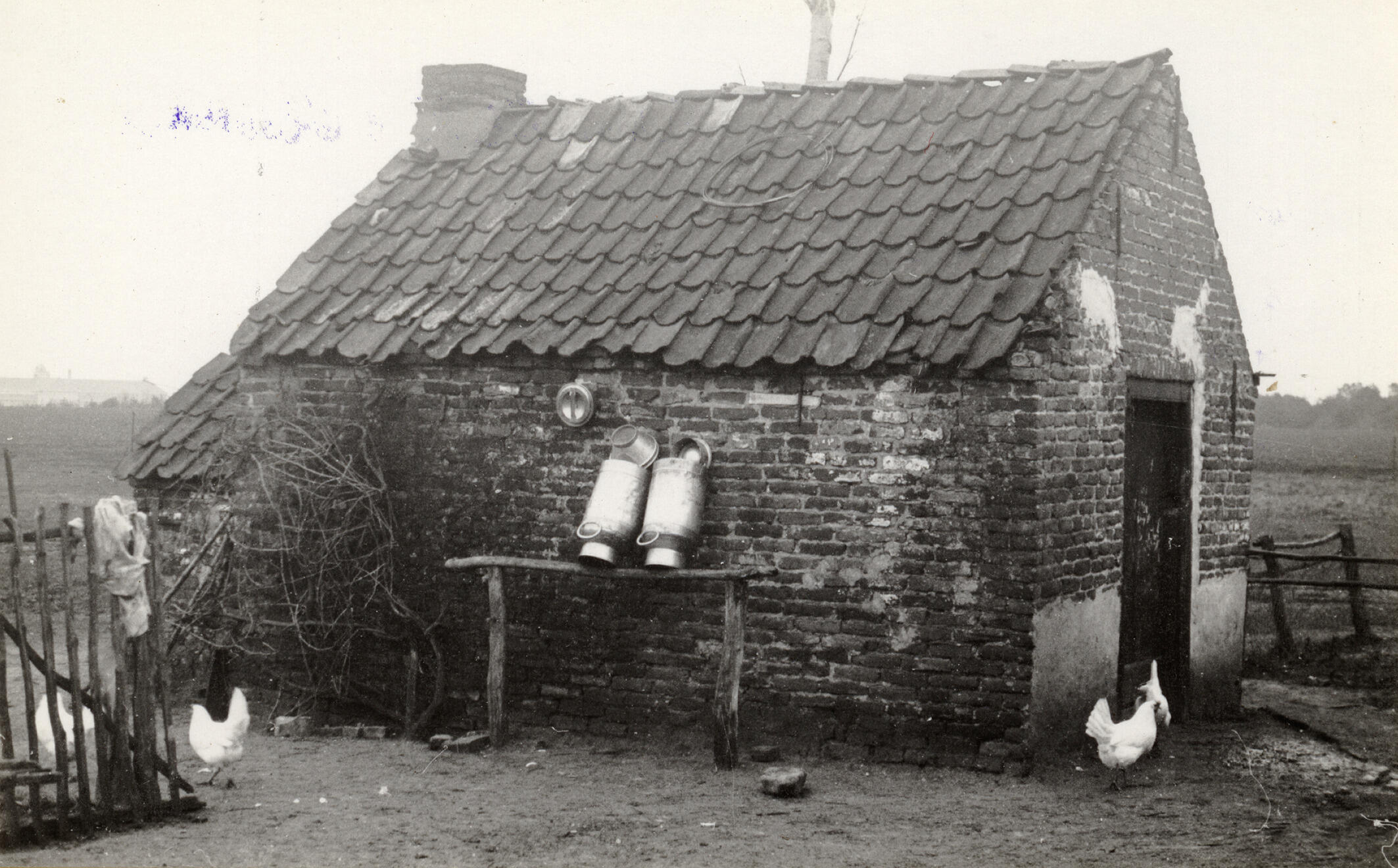 Bakhuis in Brouwhuis, met melkbussen en kippen.