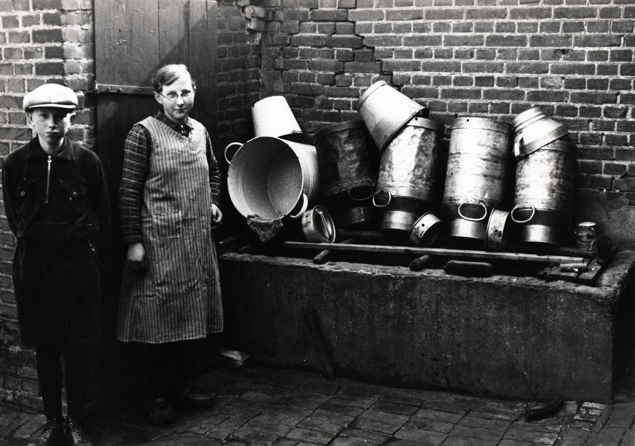 Koelbak met melkgerei, Beers, 1936 (zwart-wit foto)