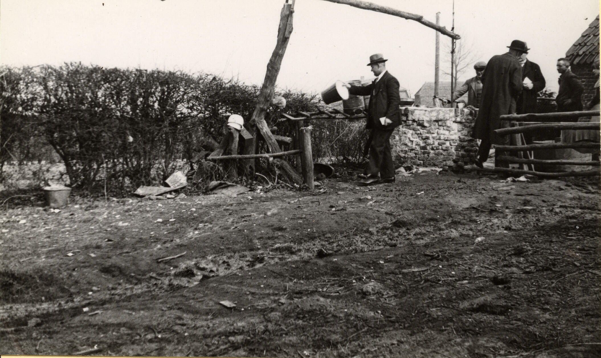 Een waterput met puthaal met daarnaast een emmerrek in Beers. Rechts staat een groep mannen.