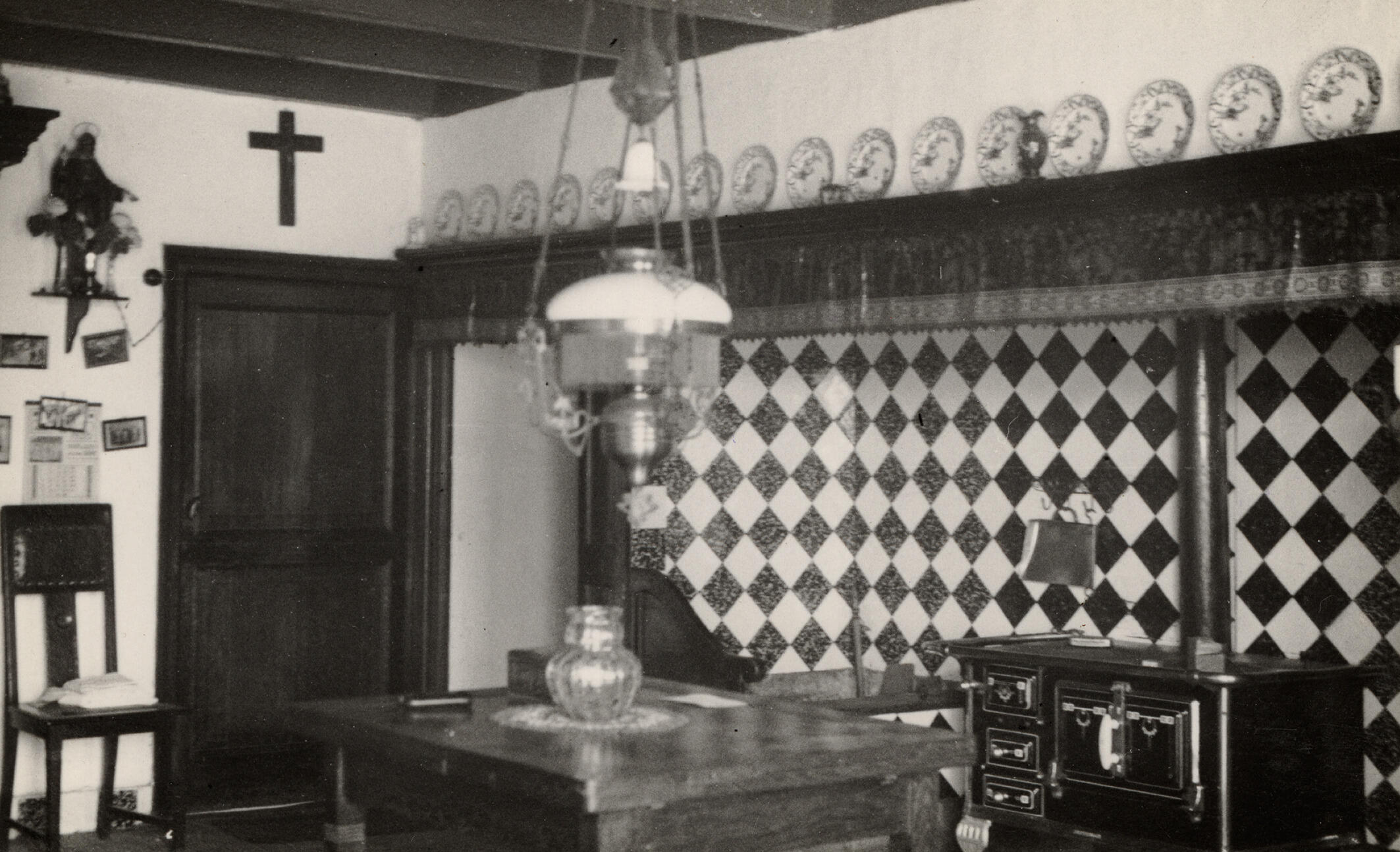 Keukeninterieur van een boerderij, Beers, april 1936 (zwart-wit foto)