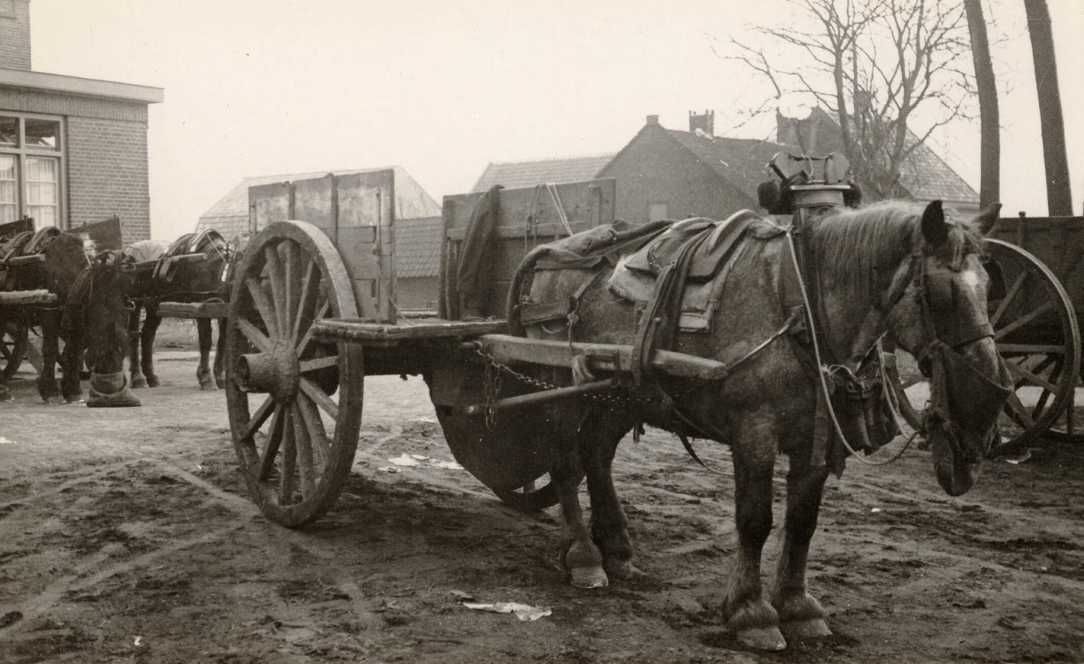 Paard en wagen bij een melkfabriek in Veghel. Het paard heeft een voederzak aan zijn paardentuig hangen. Op de achtergrond staan nog meer paarden en wagens.