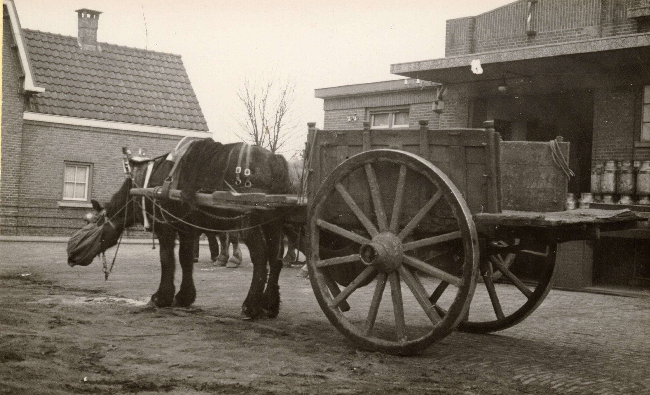 Paard en wagen bij een melkfabriek in Veghel. Het paard eet uit de voederzak, die aan het tuig is bevestigd.
