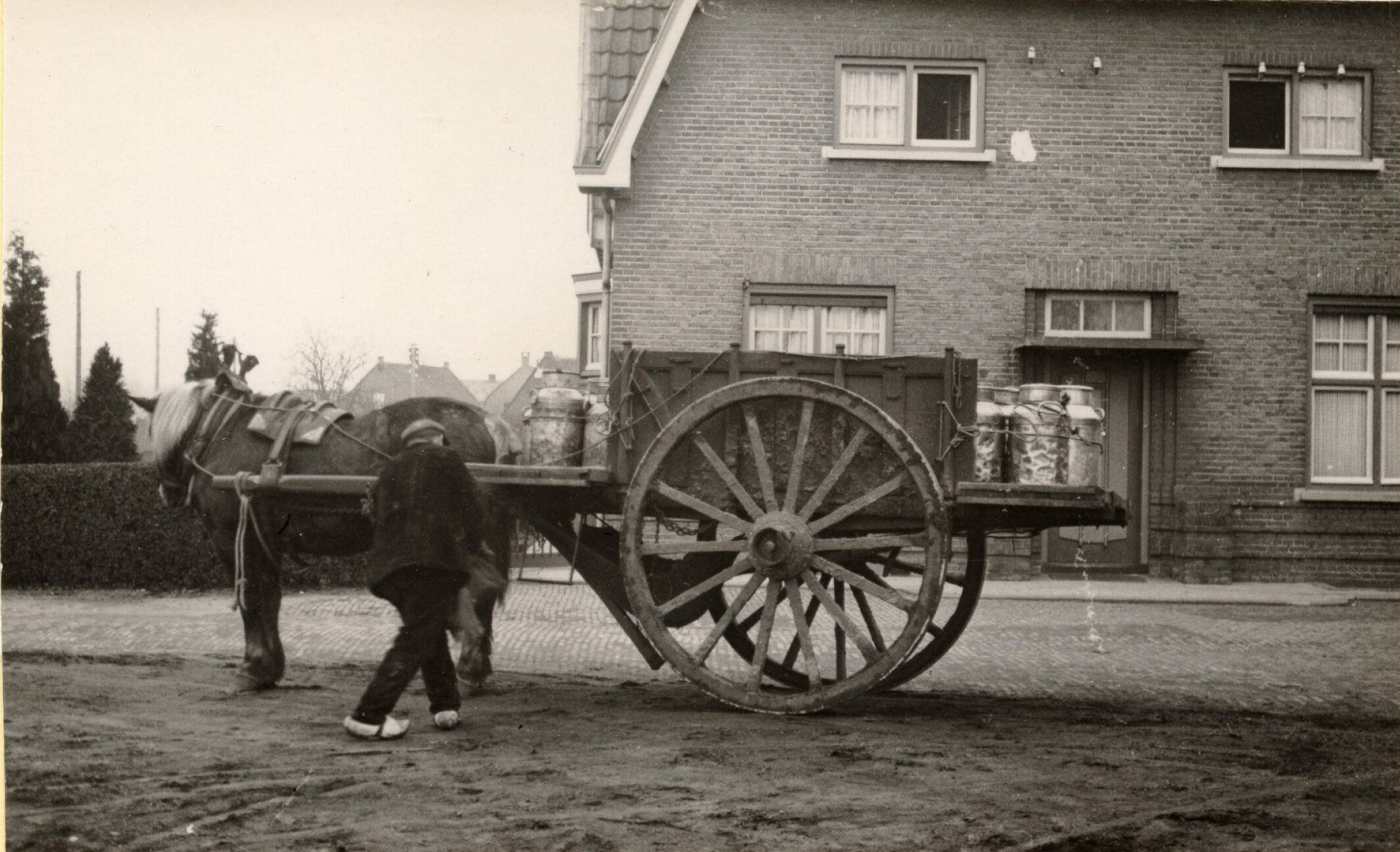 Paard en wagen met melkbussen, Veghel, 1936 (zwart-wit foto)