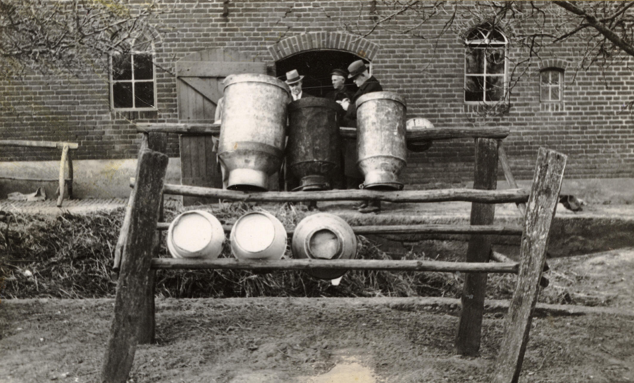 Melkbussenrek naast een mestvaalt bij een boerderij in Beers. In de deuropening staan drie mannen, mogelijk de boer met twee bezoekers.