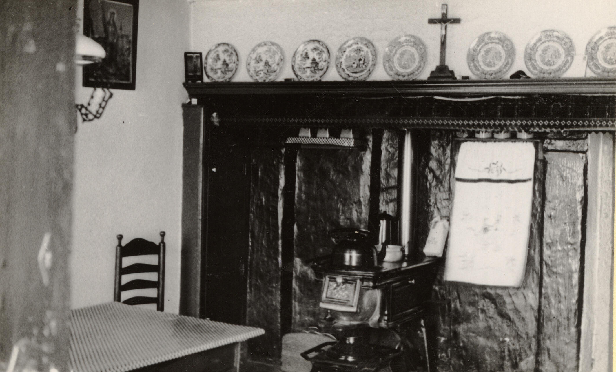 Keukeninterieur van een boerderij, Beers, 1936 (zwart-wit foto)