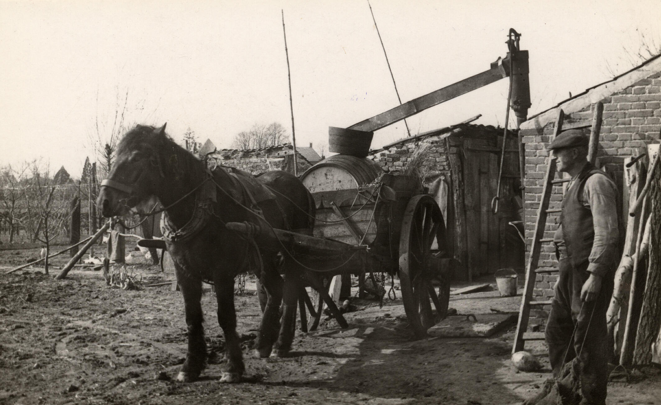 Paard en wagen voor het pompen van gier, Deurne, 1936 (zwart-wit foto)