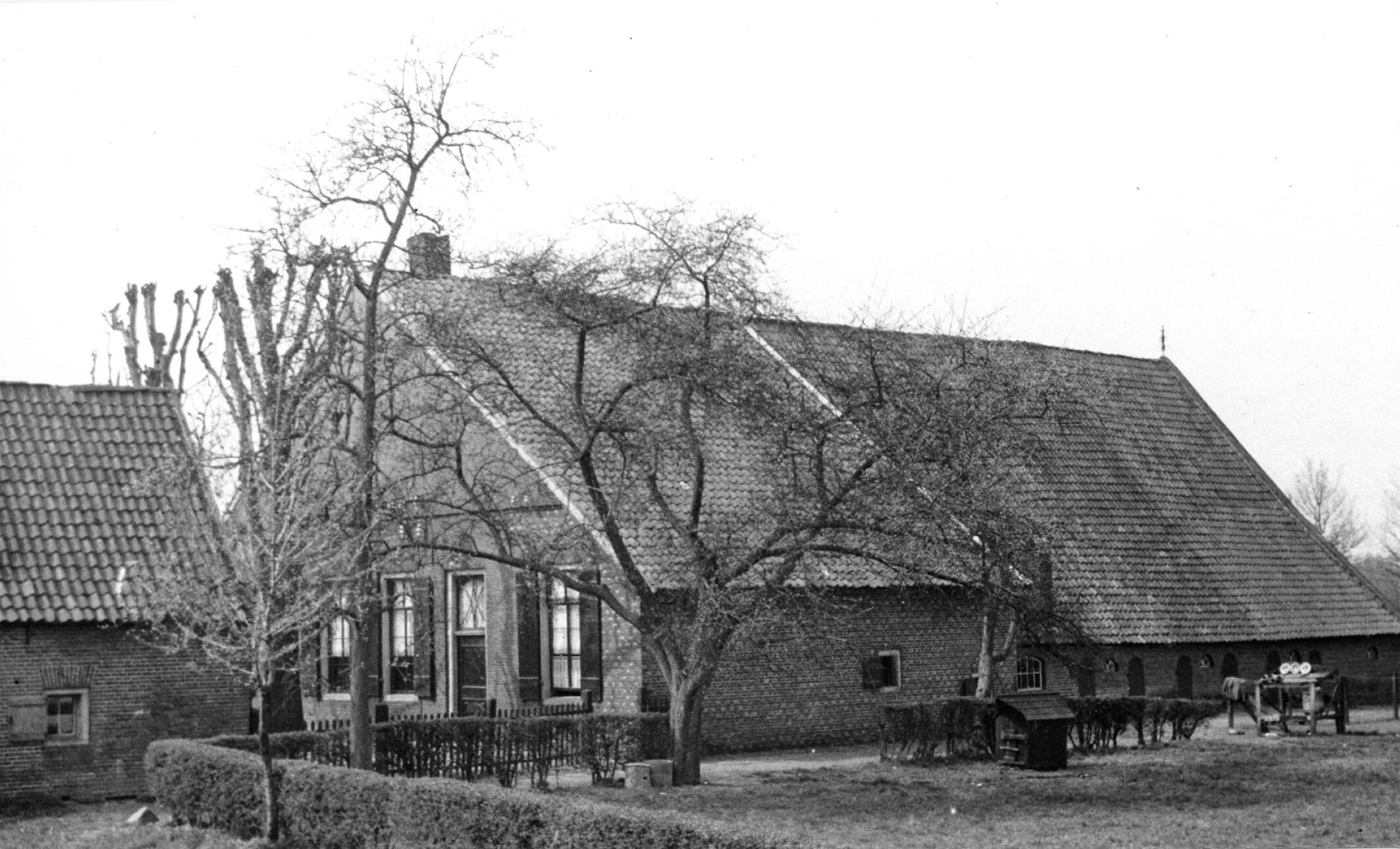 Voor- en zijgevel van een boerderij in Groenlo. De ramen aan de voorgevel zijn voorzien van luiken en de voordeur heeft een versierd bovenlicht. Aan de voorkant staan leibomen. Voor de boerderij staat een bakhuis.