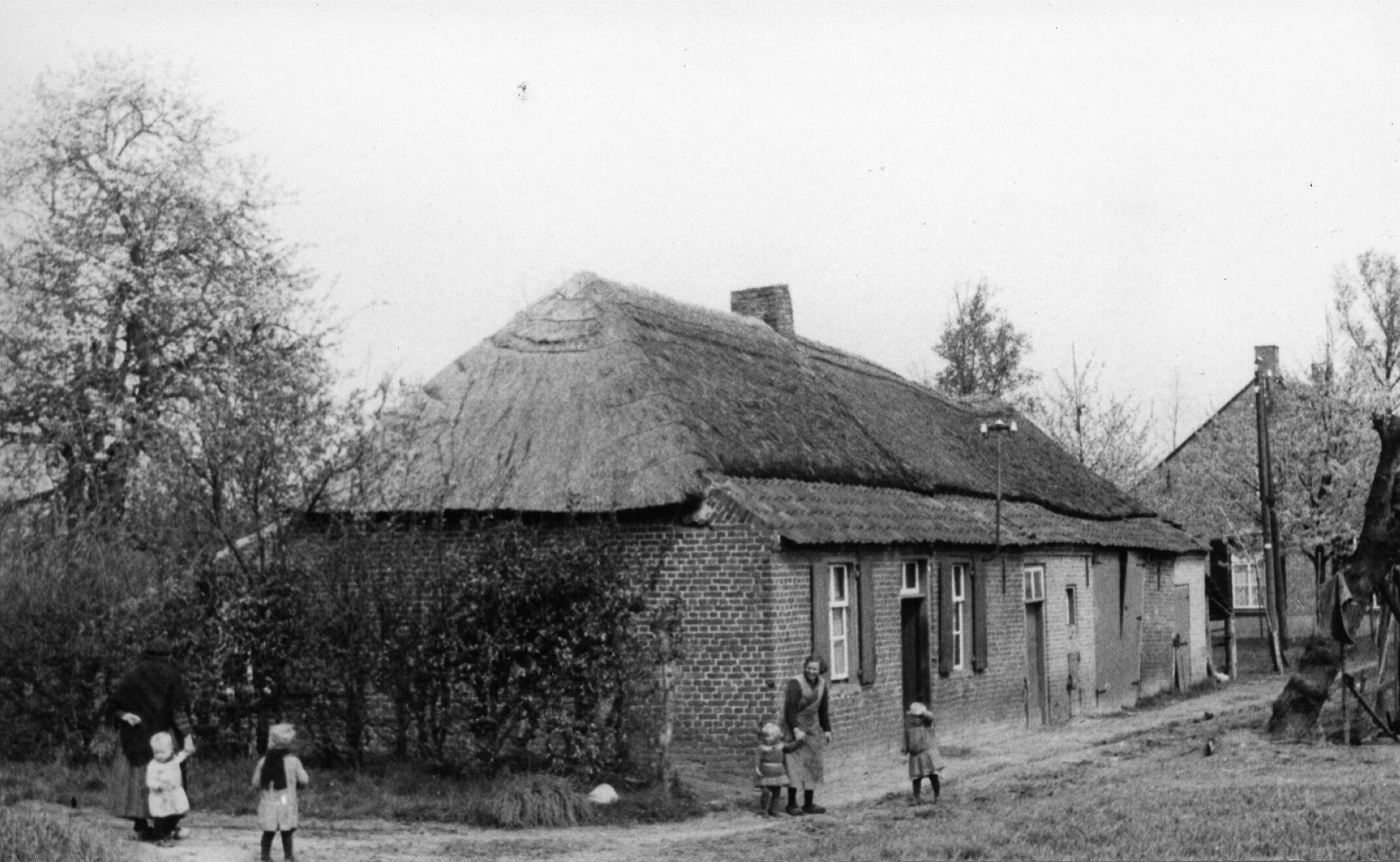 Zij- en voorgevel van een langgevelboerderij in Asten. Bij de boerderij staan twee vrouwen met elk twee kinderen.