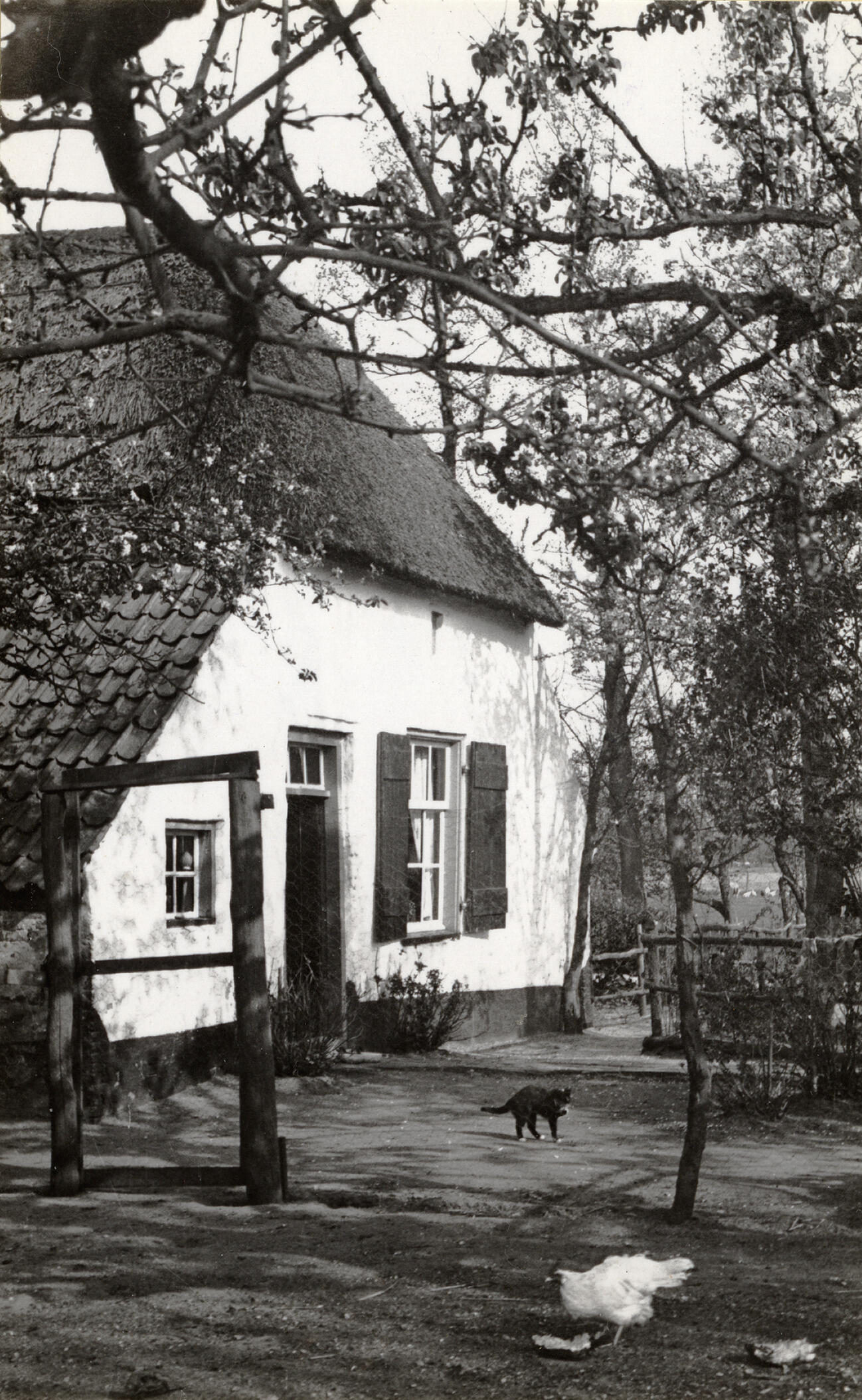 Witte voorgevel van een boerderij in Bennekom. Op het erf lopen een kat en een kip.