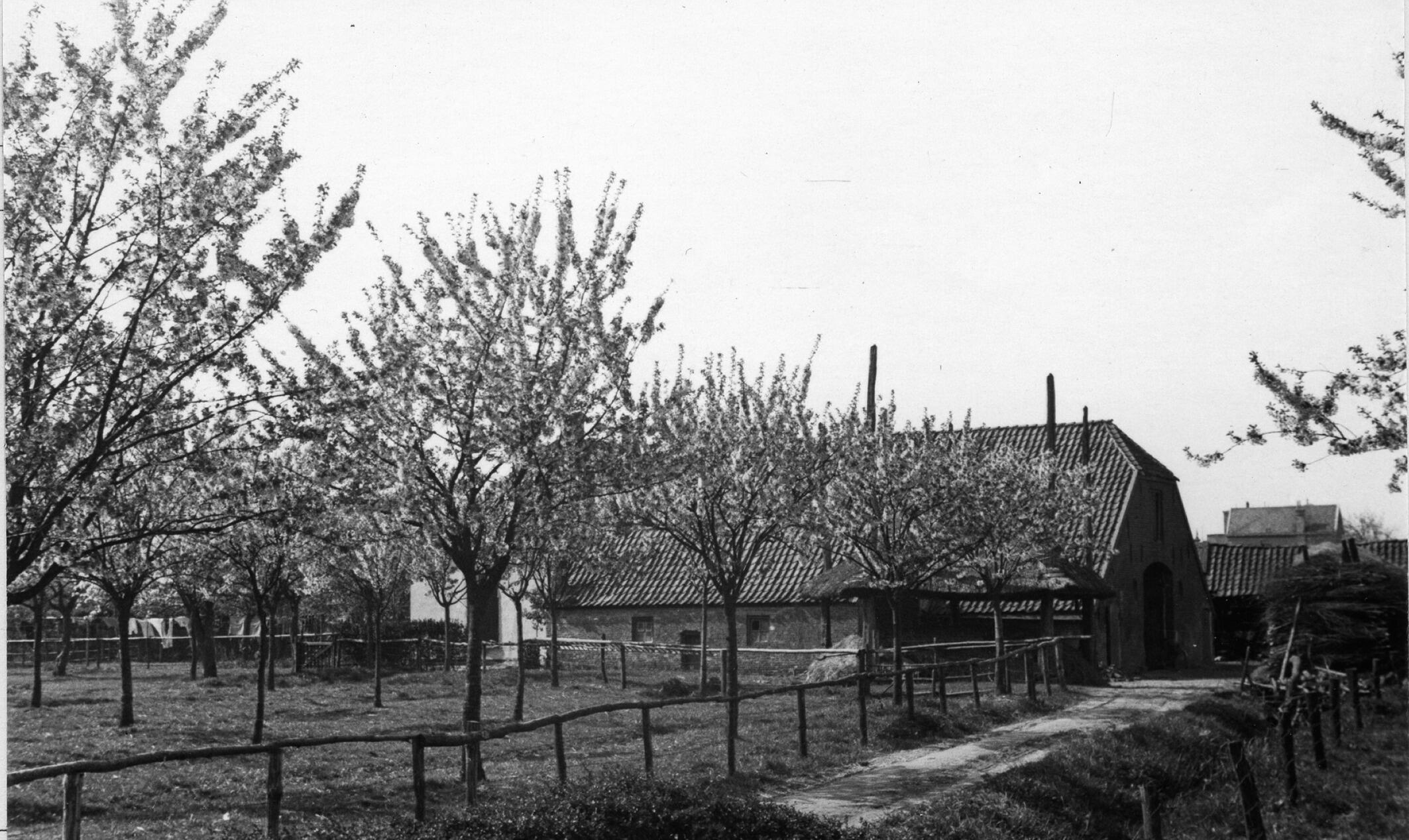 Boomgaard bij een boerderij, Wageningen, 1936 (zwart-wit negatief)