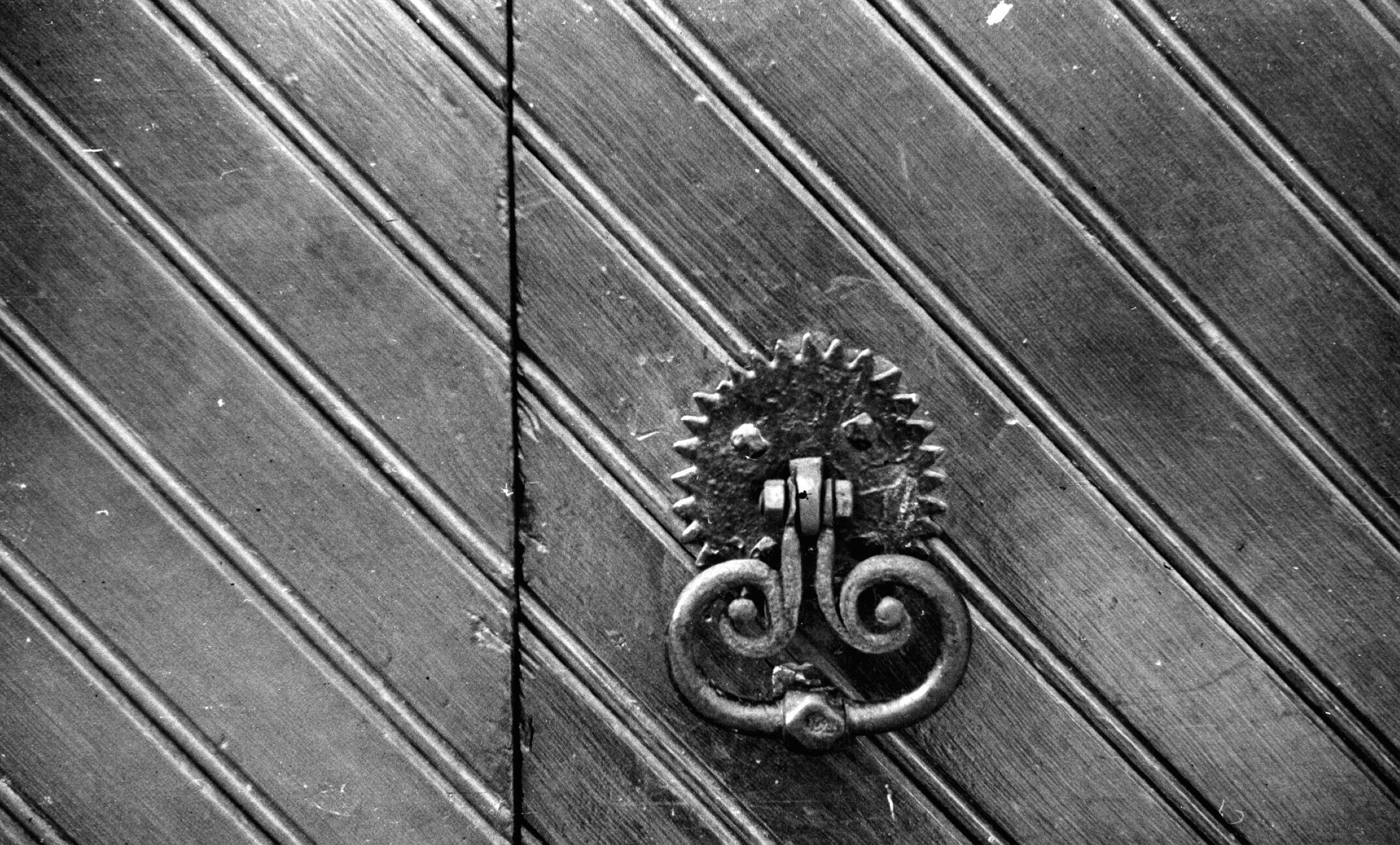 Deurklopper op baanderdeuren, Sweikhuizen, 1936 (zwart-wit foto)