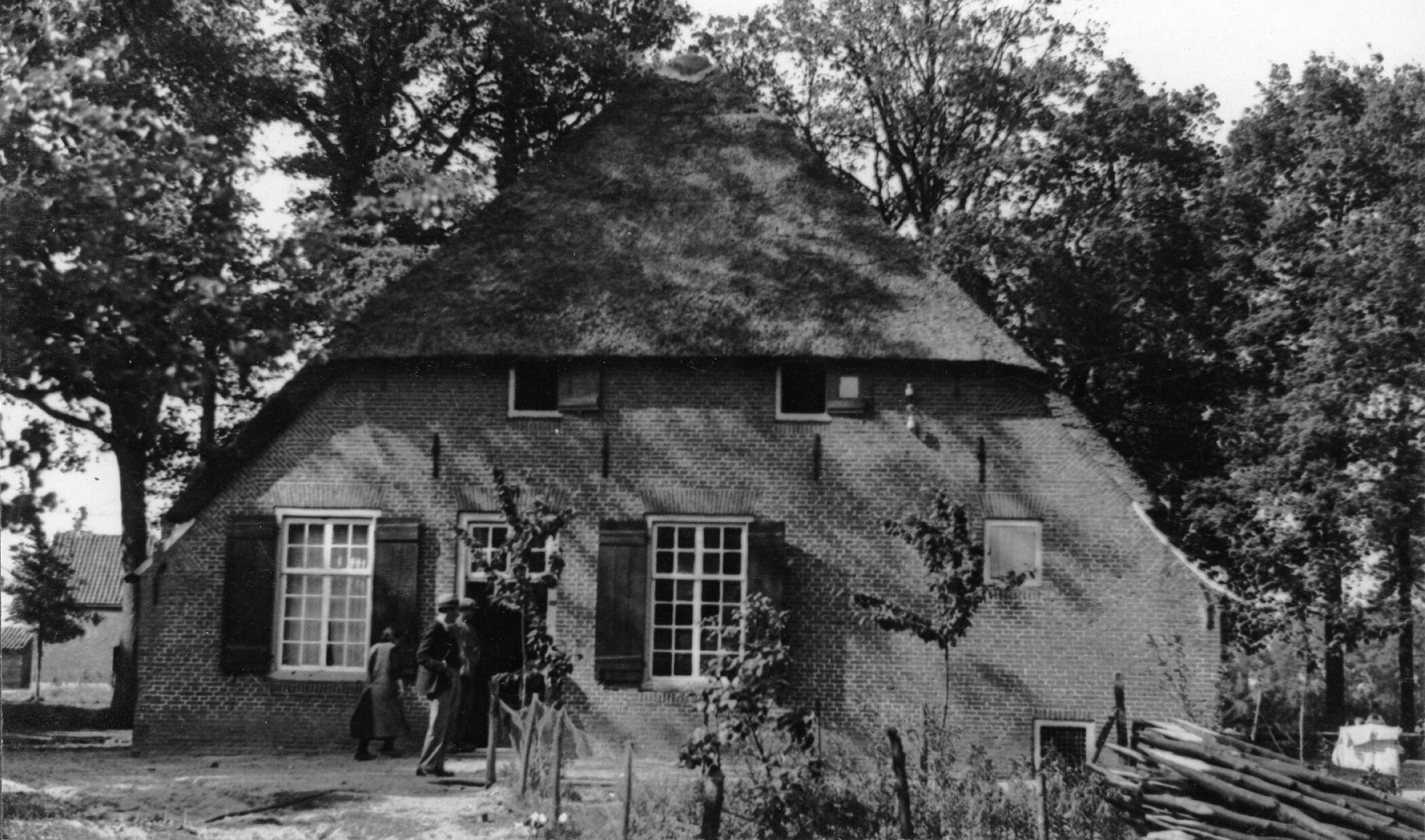 Voorgevel van een hallenhuisboerderij in Zegenwerp, met daarvoor enkele mensen.