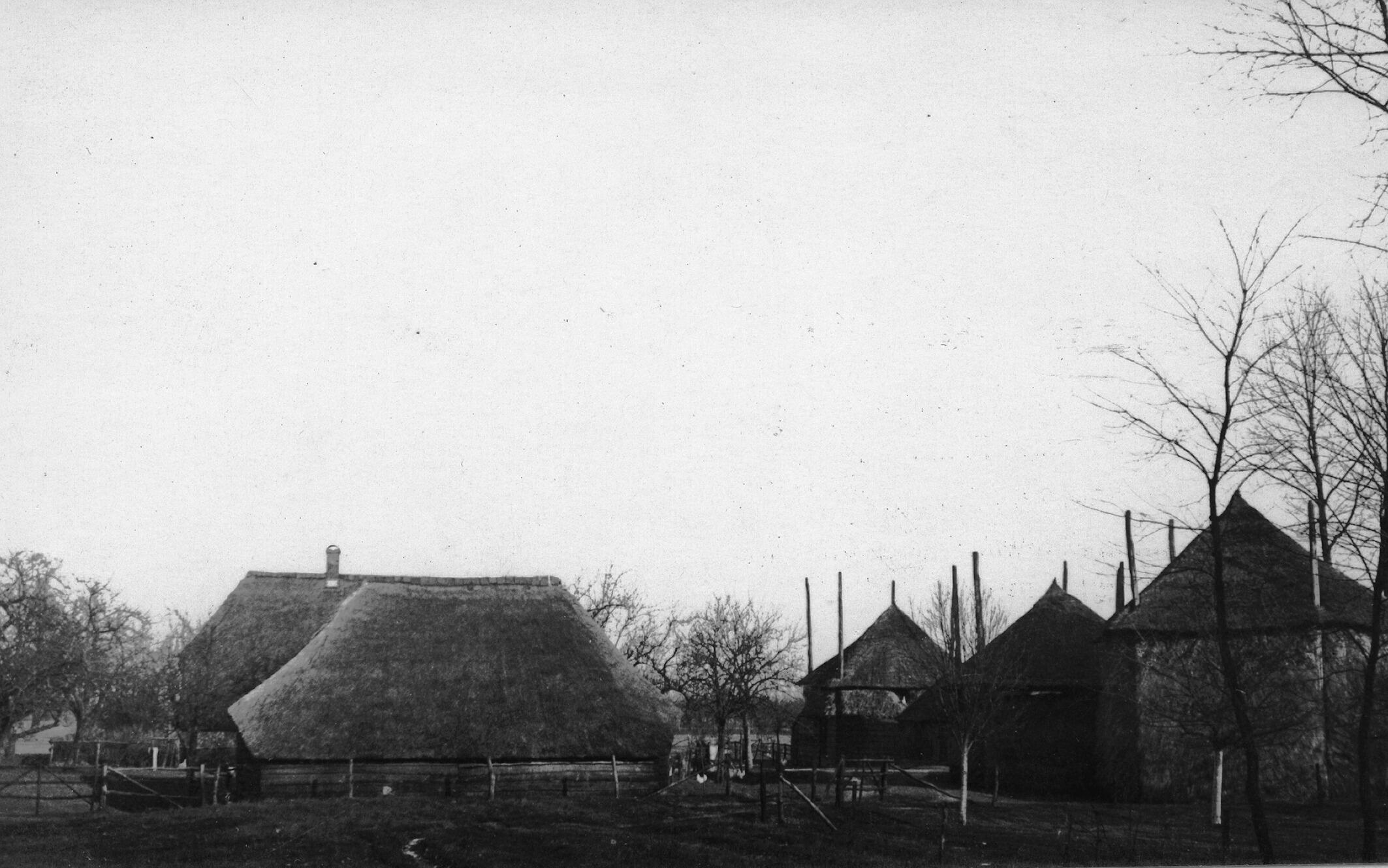 Boerenerf met schaapskooi en hooibergen, Achterberg, 1936 (zwart-wit foto)