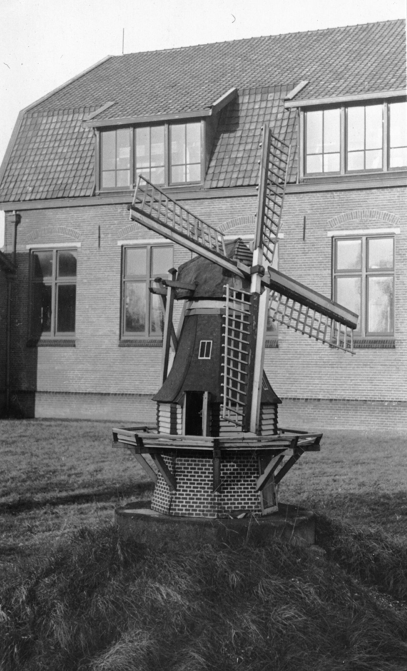 Miniatuurmolen bij maalderij en bakkerij, Wageningen, 1936 (zwart-wit foto)