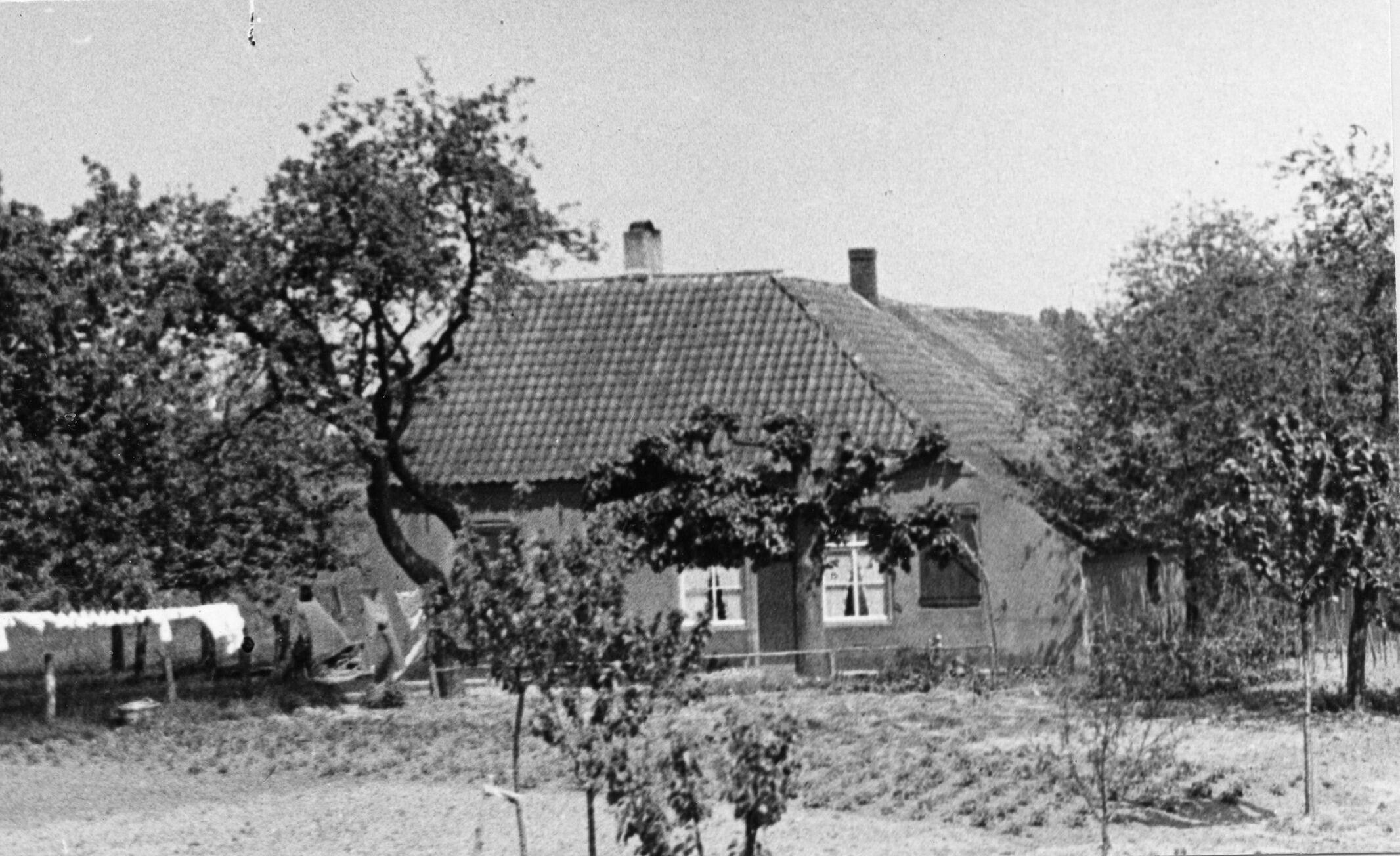 Voorgevel met voortuin van een boerderij in Heukelum. Links hangt was aan de waslijn.