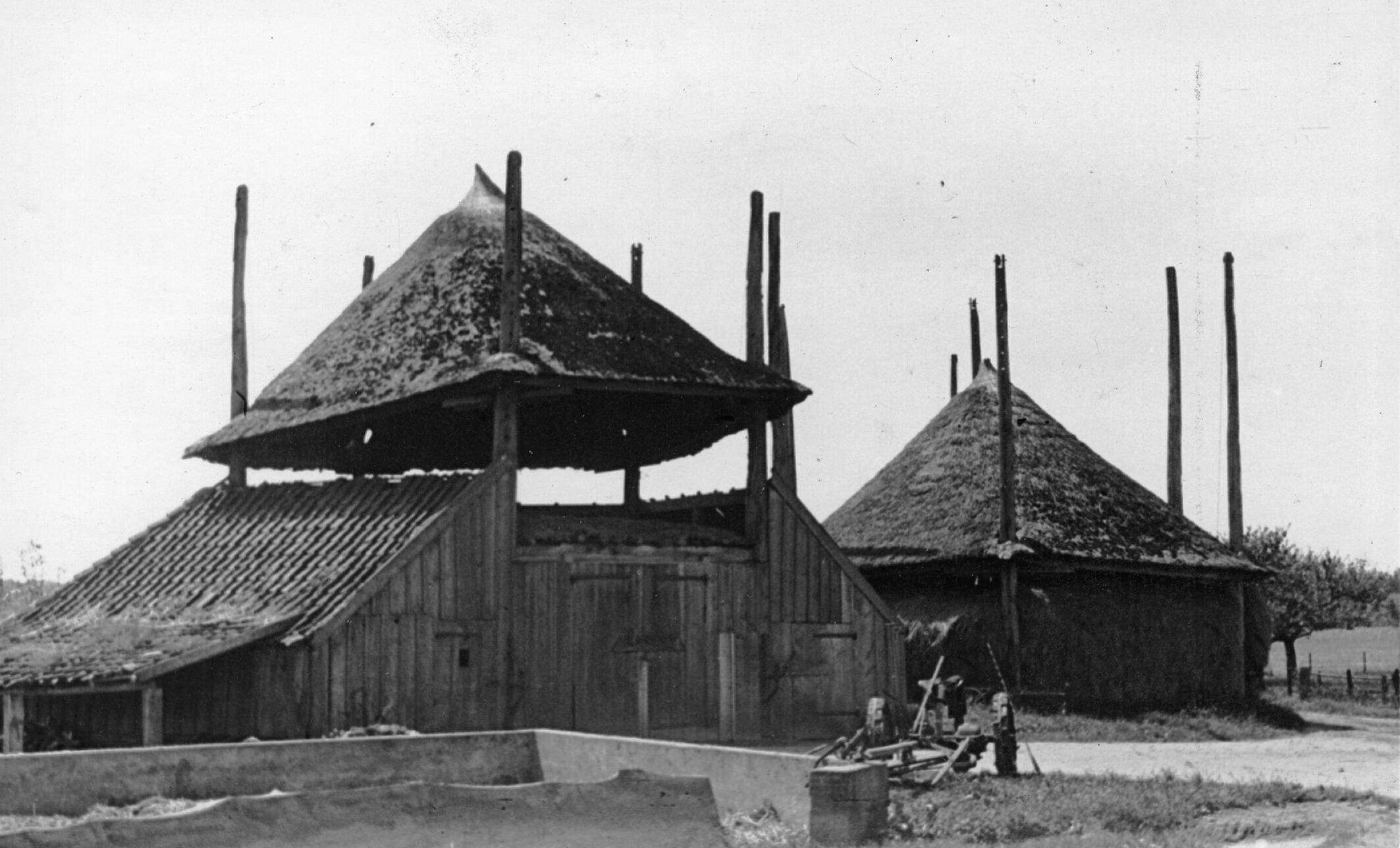 Een schuurberg en een kapberg in het Gelderse Wilp. De hooibergen hebben in hoogte verstelbare daken op roeden.