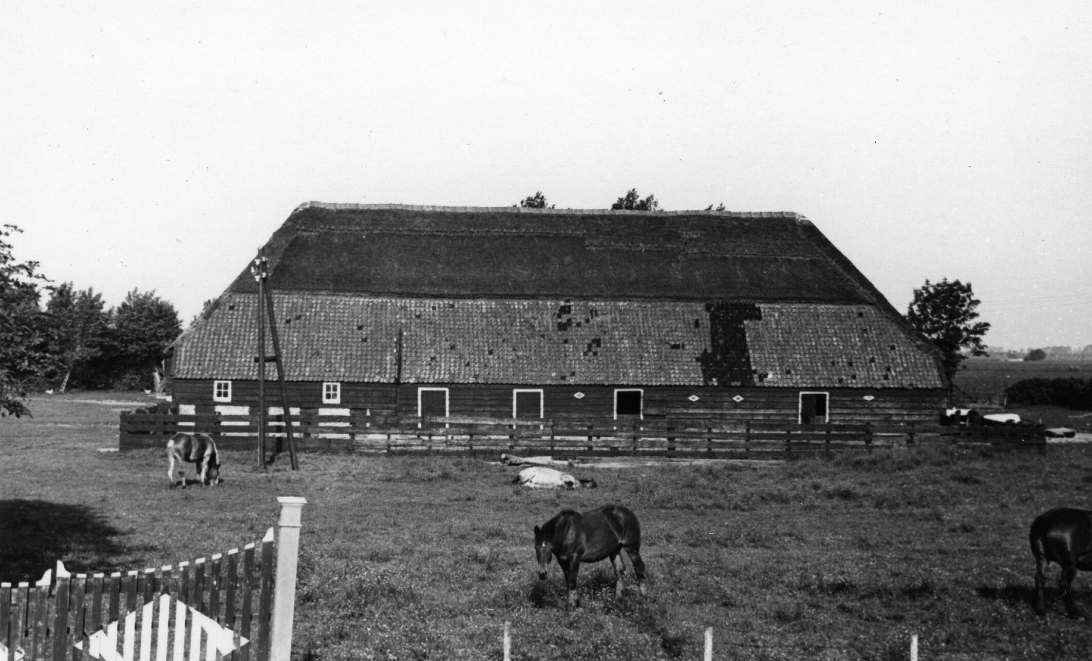 Landbouwschuur bij een boerderij in Schoondijke, met daarvoor een aantal paarden.