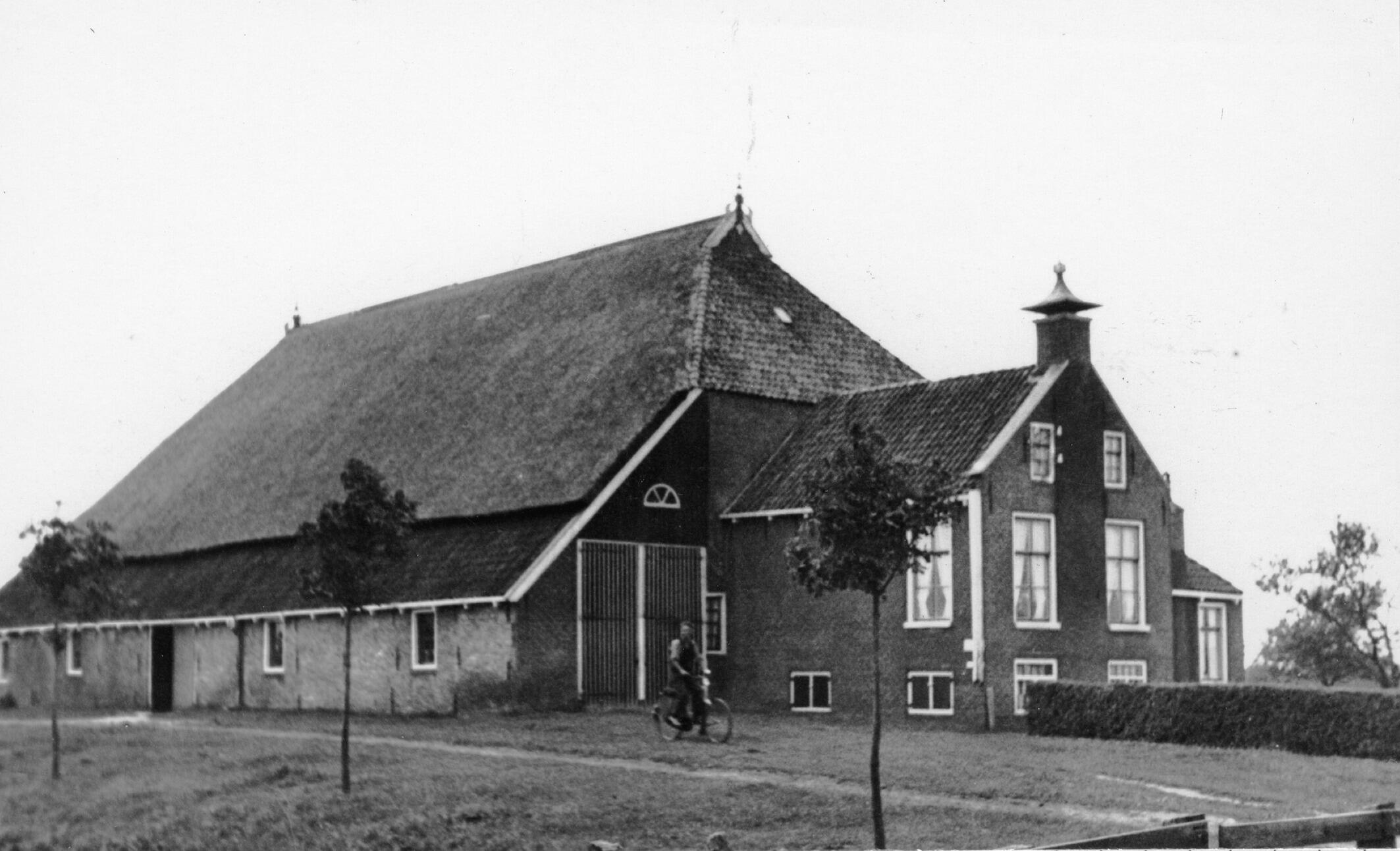 Zij- en voorgevel van een kop-rompboerderij in het Friese Mildam, met links de schuur en rechts een woonhuis met kelder en opkamer. Voor de boerderij fietst een man.