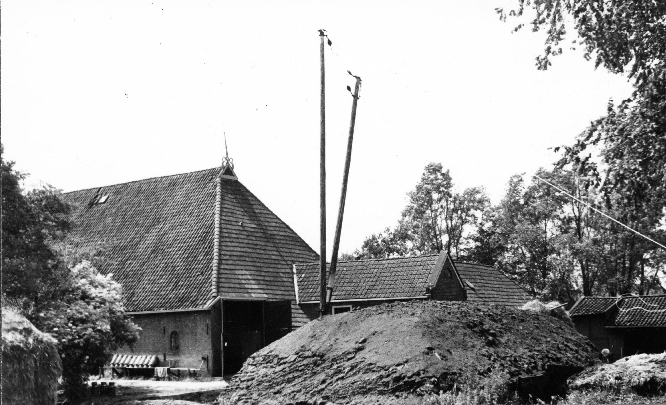 Achtererf van een boerderij in het Friese De Knipe, met een voederkuil en hijsmast.