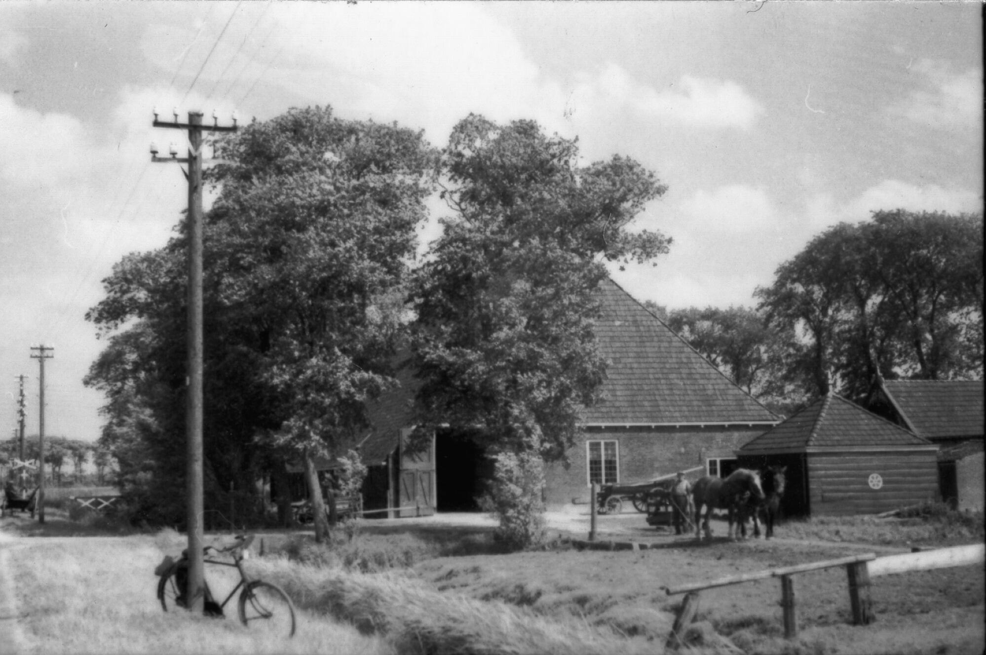 Achtergevel en erf van een boerderij met bijgebouwen in het Friese Giekerk. De inrijdeuren staan open en een boer staat buiten met twee paarden en een boerenkar. Tegen een elektriciteitsmast staat een fiets. In de verte staat een andreaskruis bij een spoorwegovergang.