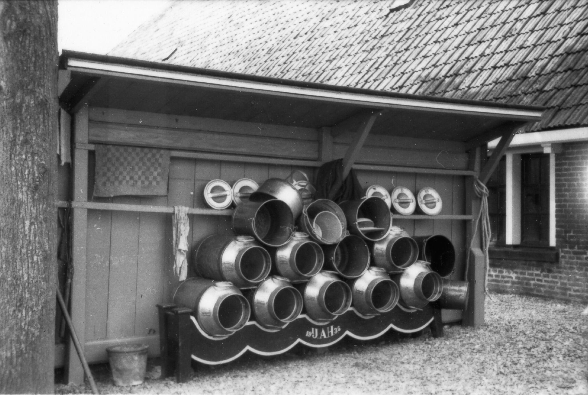 Melkbussen op een melkbussenrek bij een boerderij in het Friese Wirdum. Op het rek staat geschreven: 'IJ.A.H. 1935'.