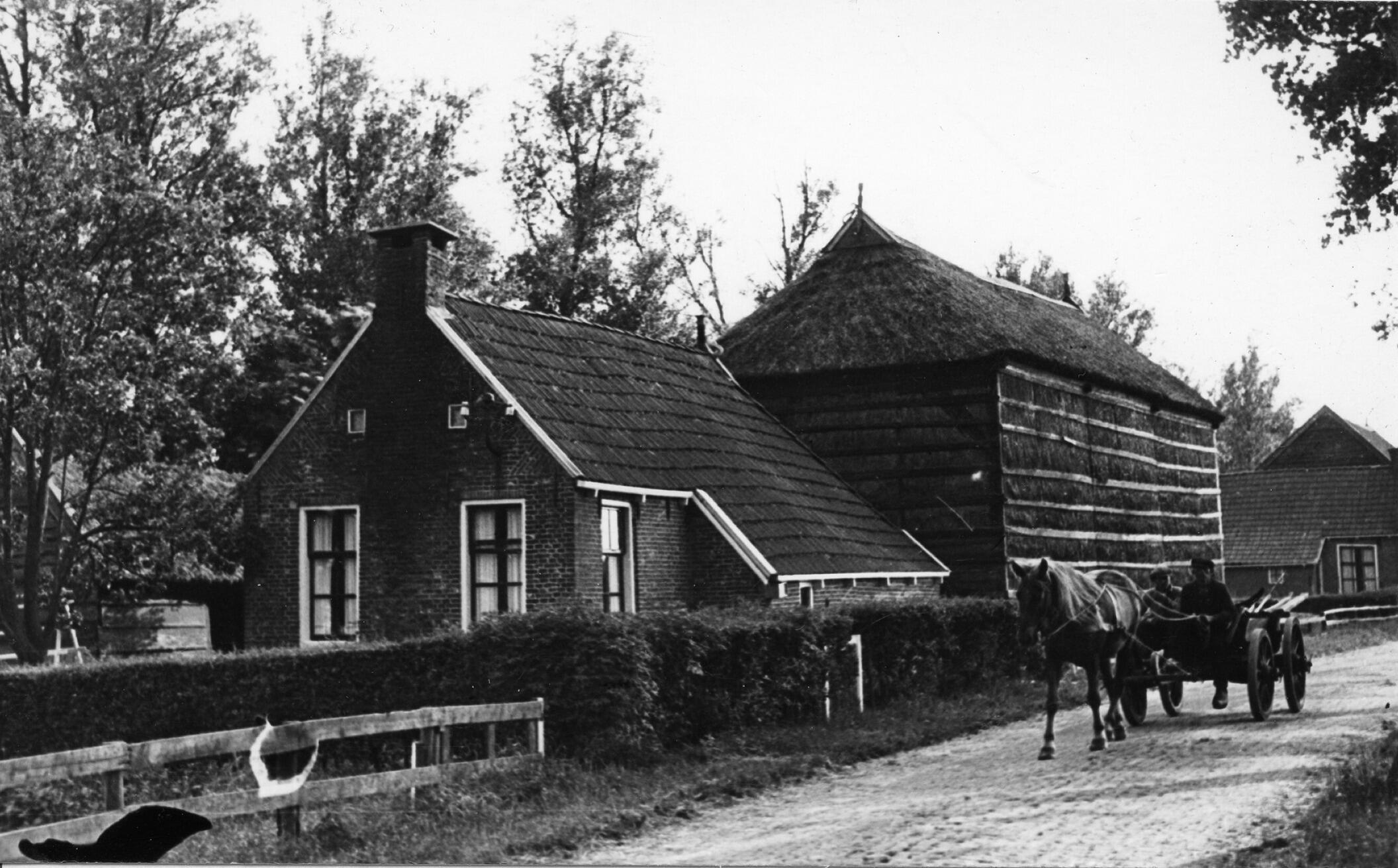 Voor- en zijgevel van een boerderij in het Friese Ter Idzard, met links het woonhuis en rechts de schuur met strowanden achter houten planken. Over de klinkerweg rijdt een paard en wagen met daarop twee mannen.
