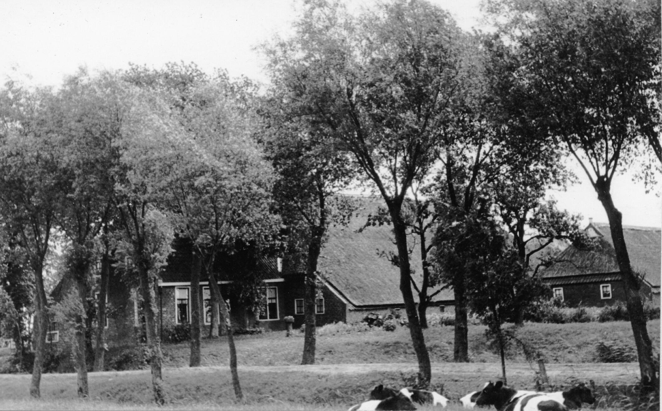 Boerderij aan de Bovenrijgerweg 10 in het Groningse Thesinge, met daarvoor bomen langs de weg en koeien in de wei.