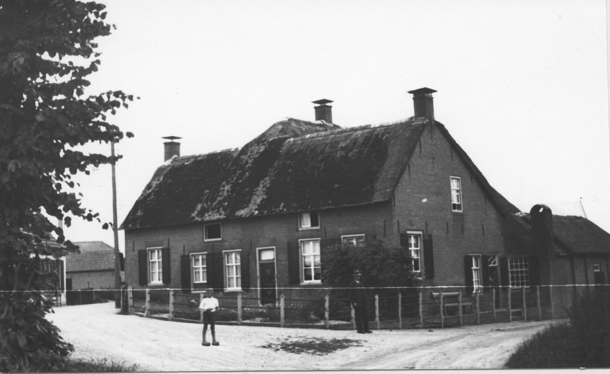 Voor- en zijgevel van het woongedeelte van een boerderij aan de Lingedijk in Tricht. Op straat staan een jongen en een man.