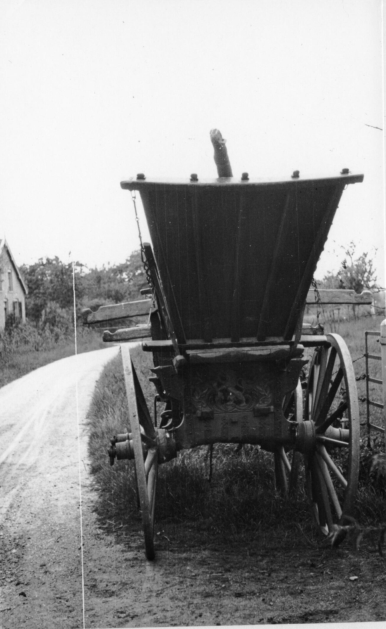 Achterzijde van een boerenwagen in Tricht, waarvan de schamel is versierd met een leeuw.