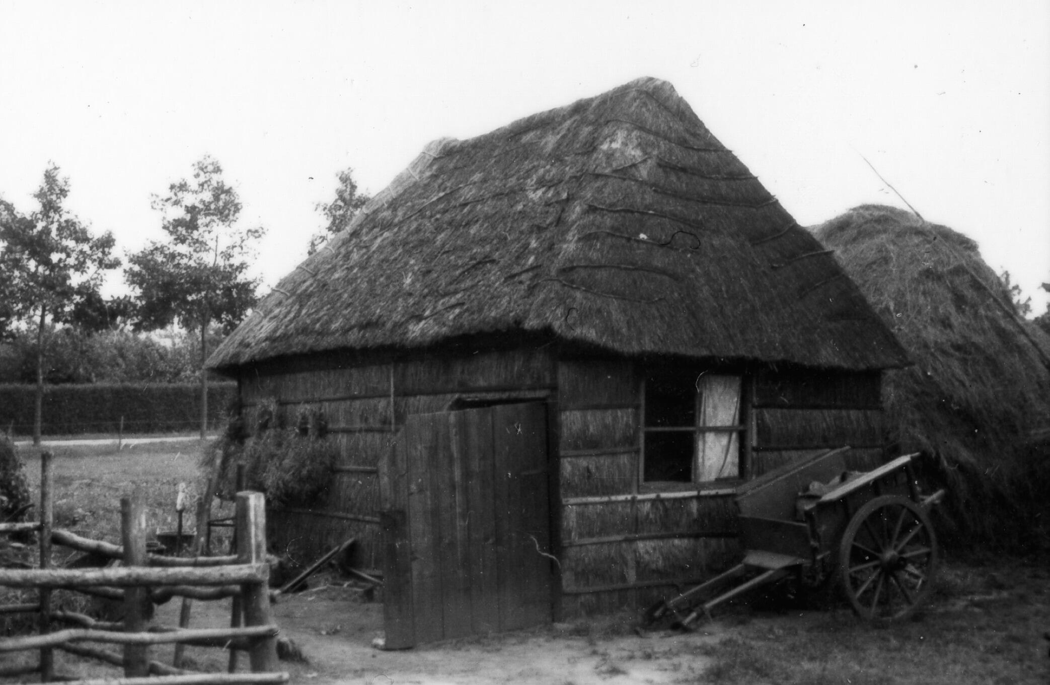 Schuur of hut met muren en een dak van stro in Vlijmen, met daarvoor een paardenkar.