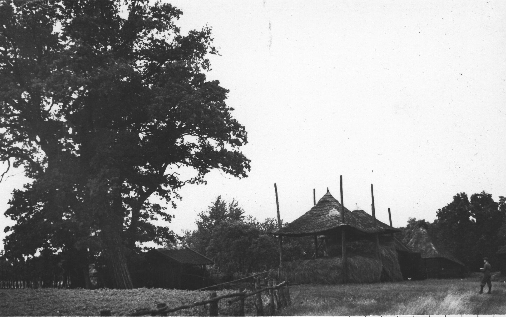 Het boerenerf van boerderij Lonnenberg in het Gelderse Heelsum, met een grote boom, hooibergen en een schaapskooi. Rechts loopt een man.