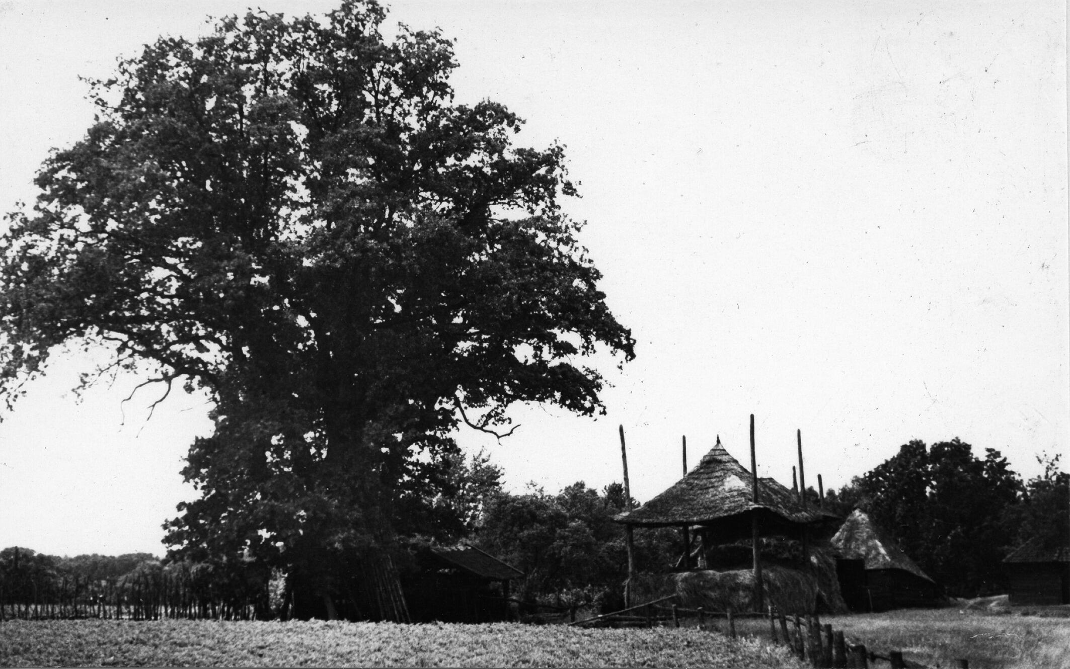 Het boerenerf van boerderij Lonnenberg in het Gelderse Heelsum, met een grote boom, hooibergen en een schaapskooi.