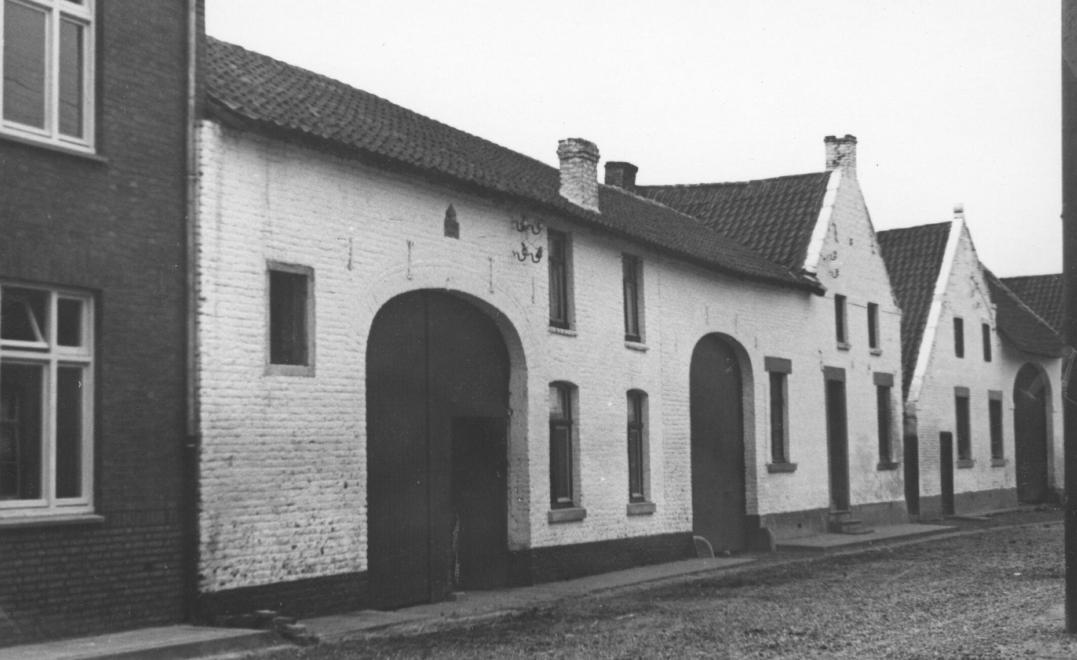 Witgepleisterde voorgevel van een vierkantshoeve in het Limburgse Heer, met drie grote inrijdeuren.