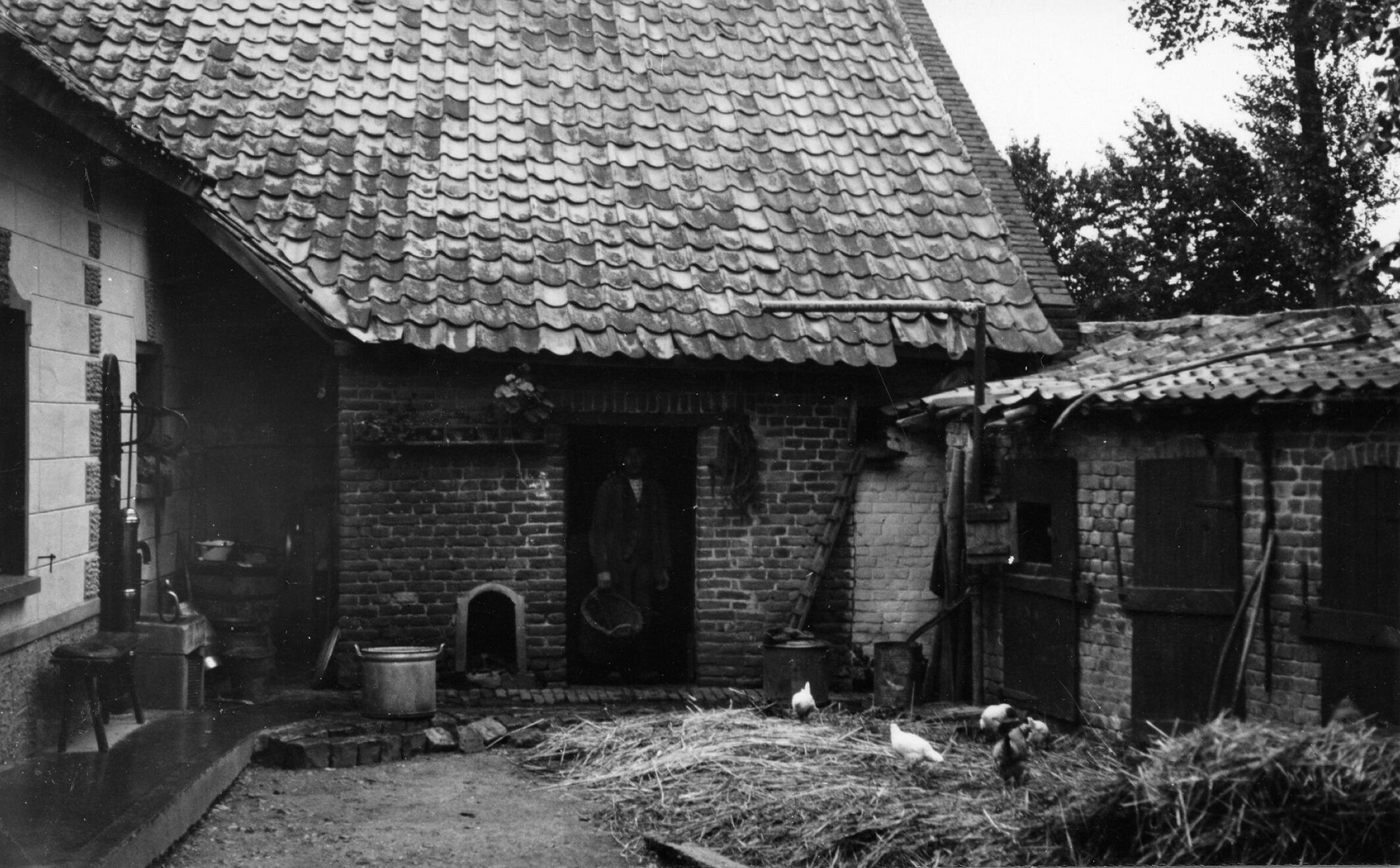 Binnenplaats van een boerderij in het Limburgse Herkenbosch, met een mestvaalt en kippen. In de deuropening staat een man met een mand in zijn hand.
