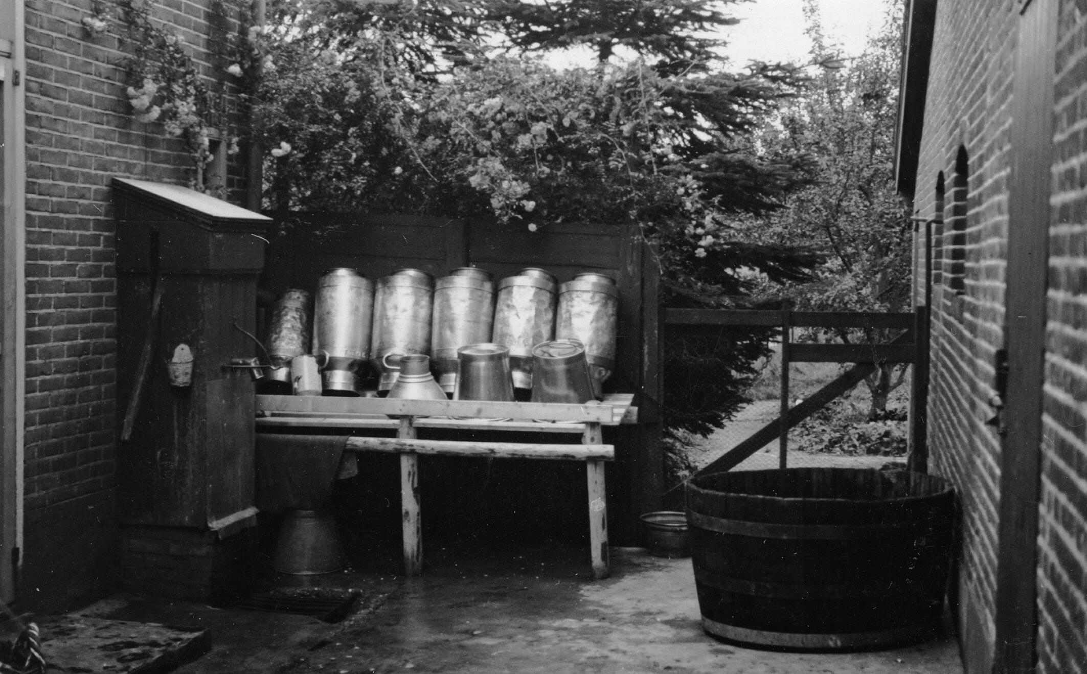 Spoelplaats met een melkbussenrek en een ton voor melkkoeling bij een boerderij in het Gelderse Loenen.