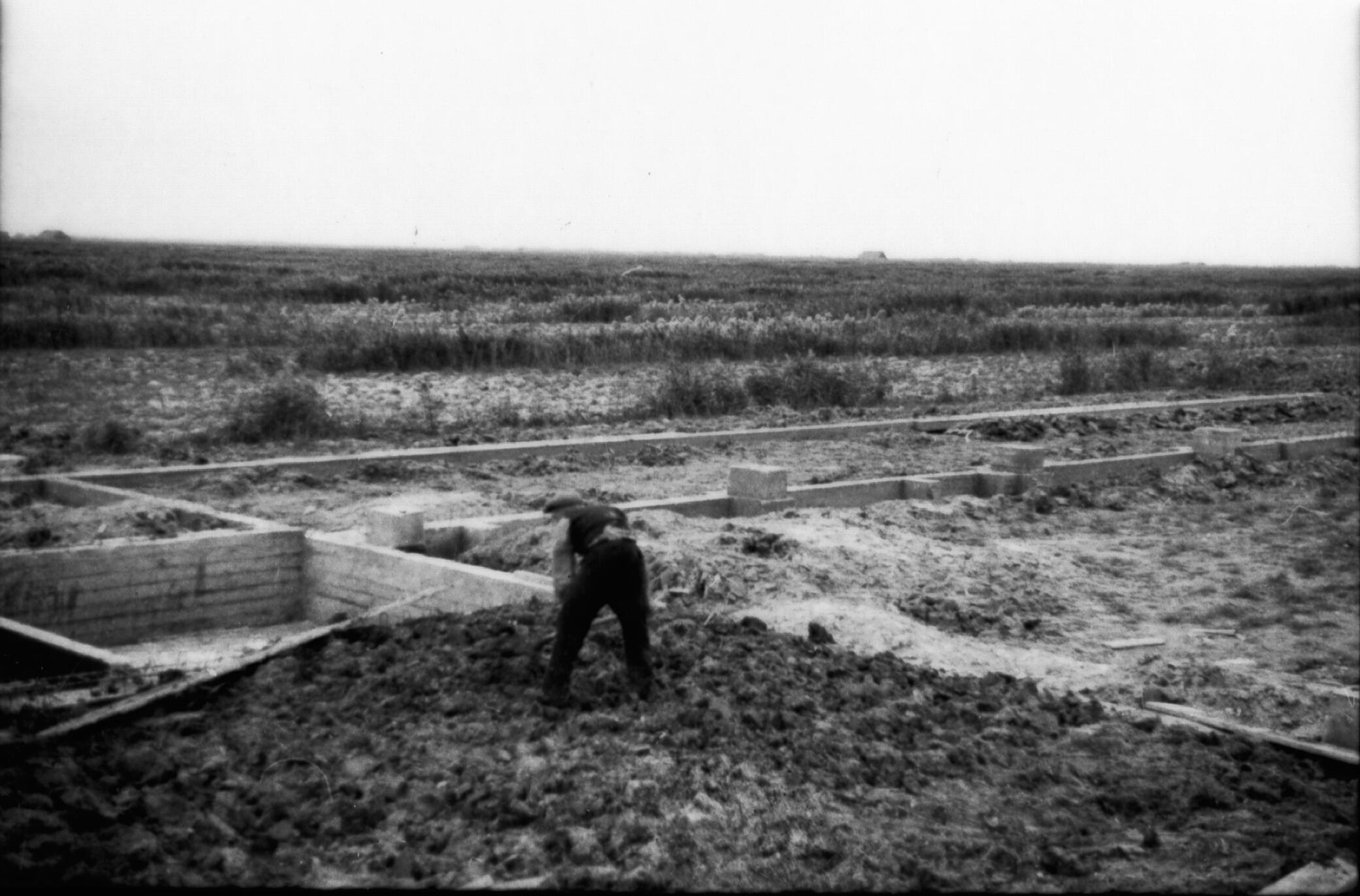 Betonnen fundering van een boerderij, Wieringermeer, 1936 (zwart-wit negatief)