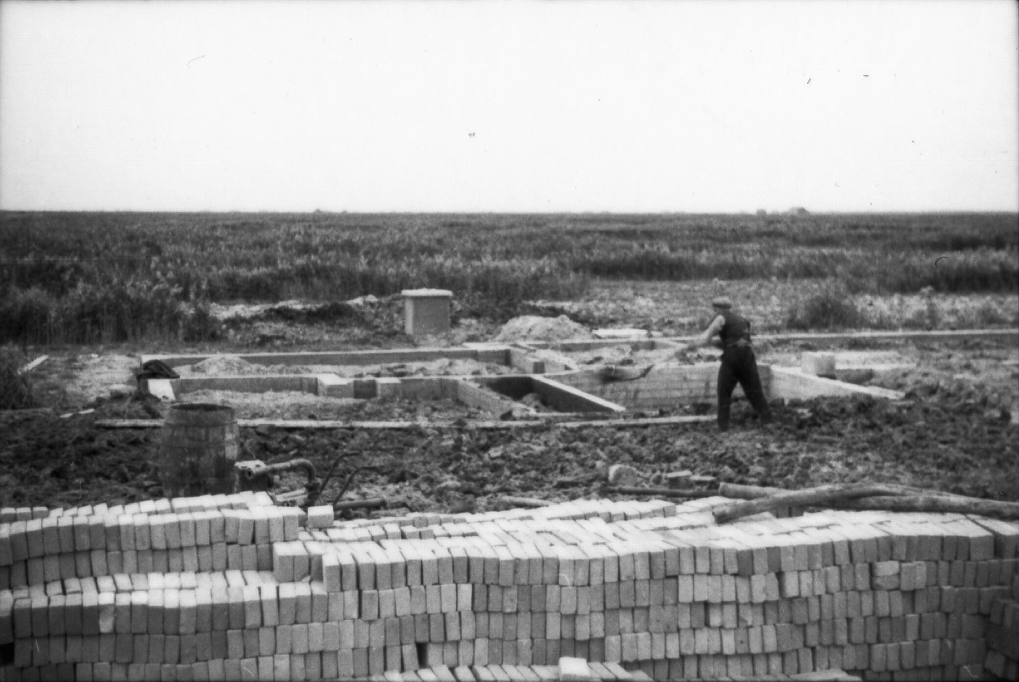 Betonnen fundering van een boerderij, Wieringermeer, 1936 (zwart-wit negatief)
