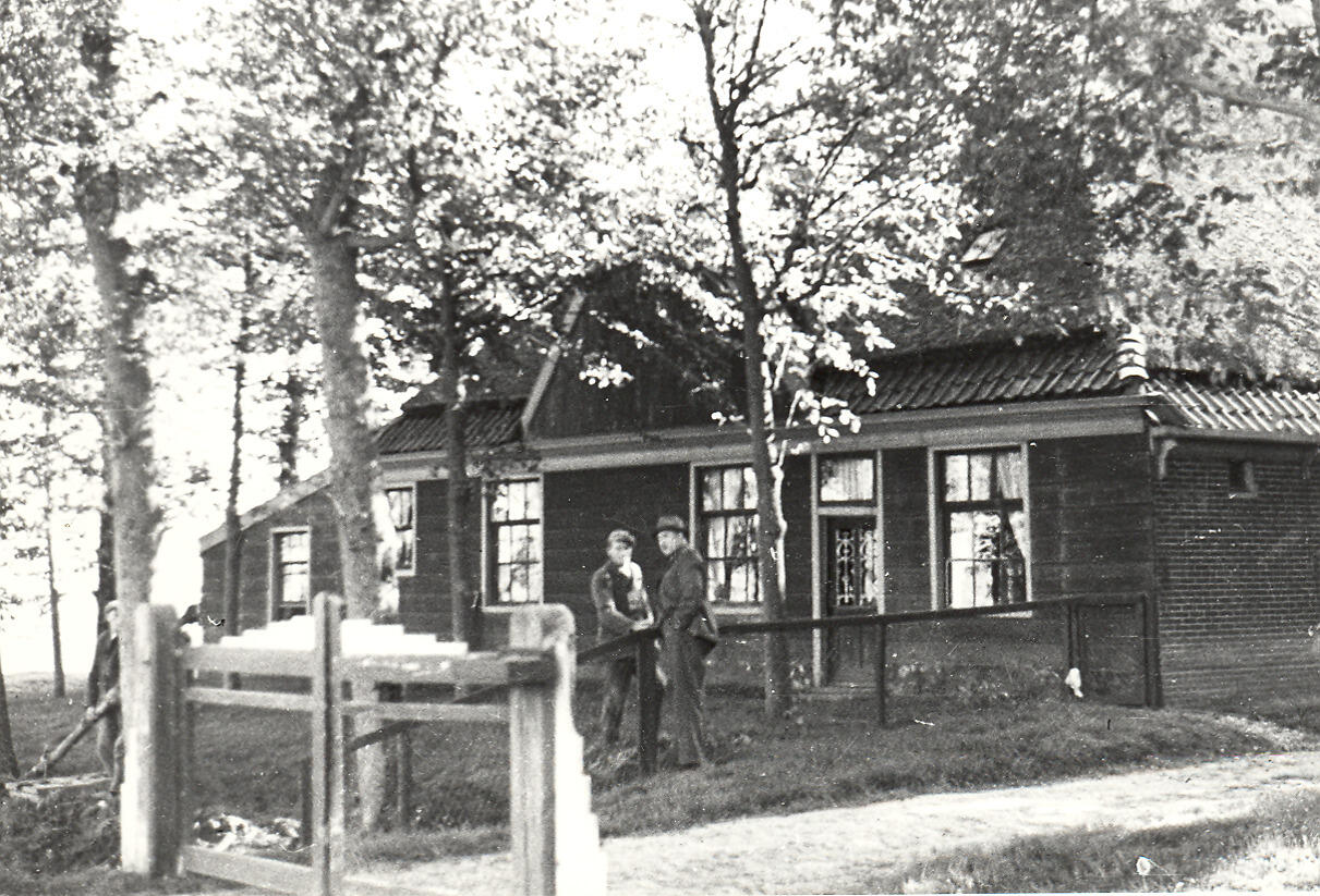 Boerderij in het Noord-Hollandse Schermer. Voor de boerderij staan een man en twee jongens.