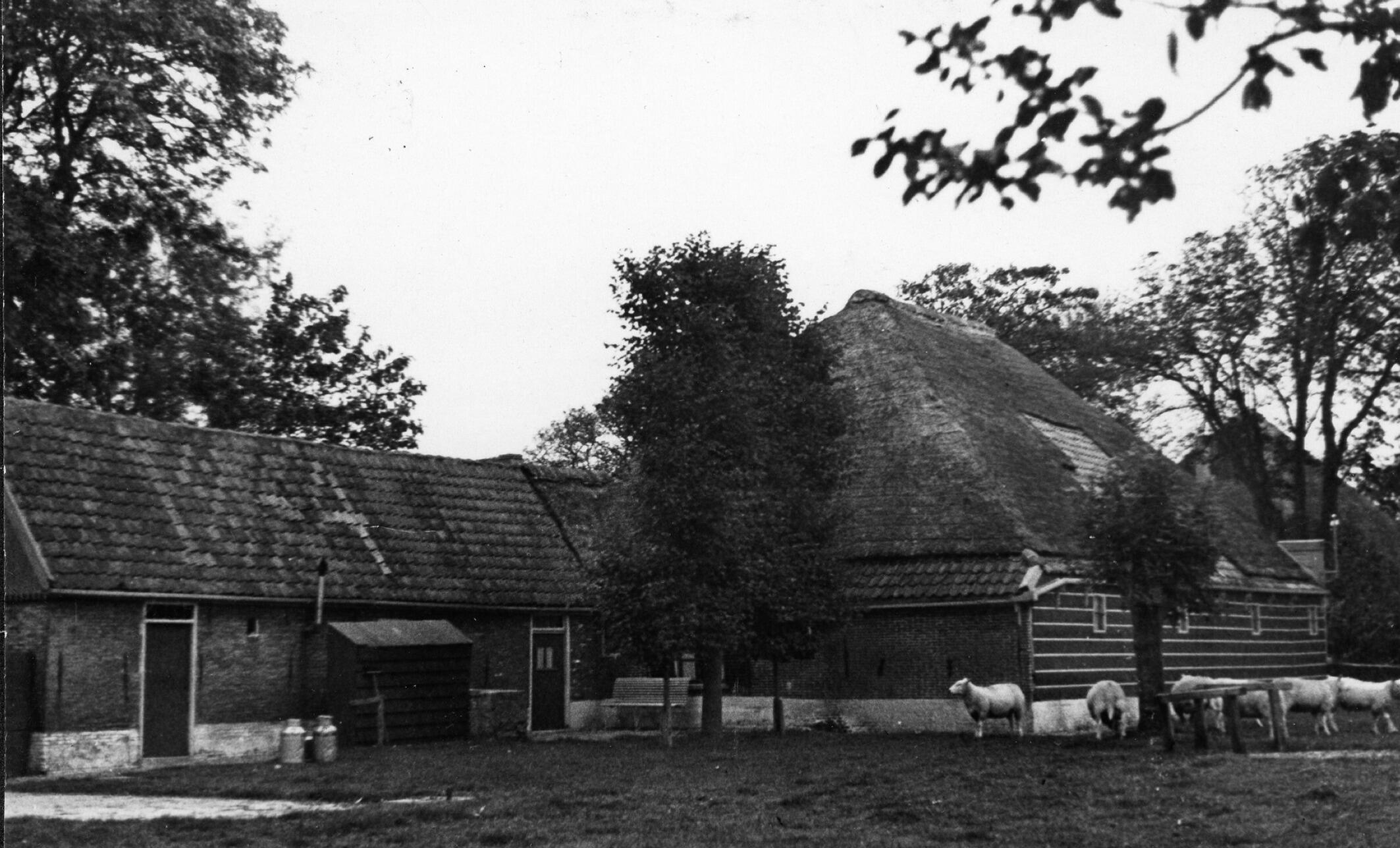 Stolpboerderij met een aanbouw in het Noord-Hollandse Oudendijk. Naast de boerderij staan schapen.