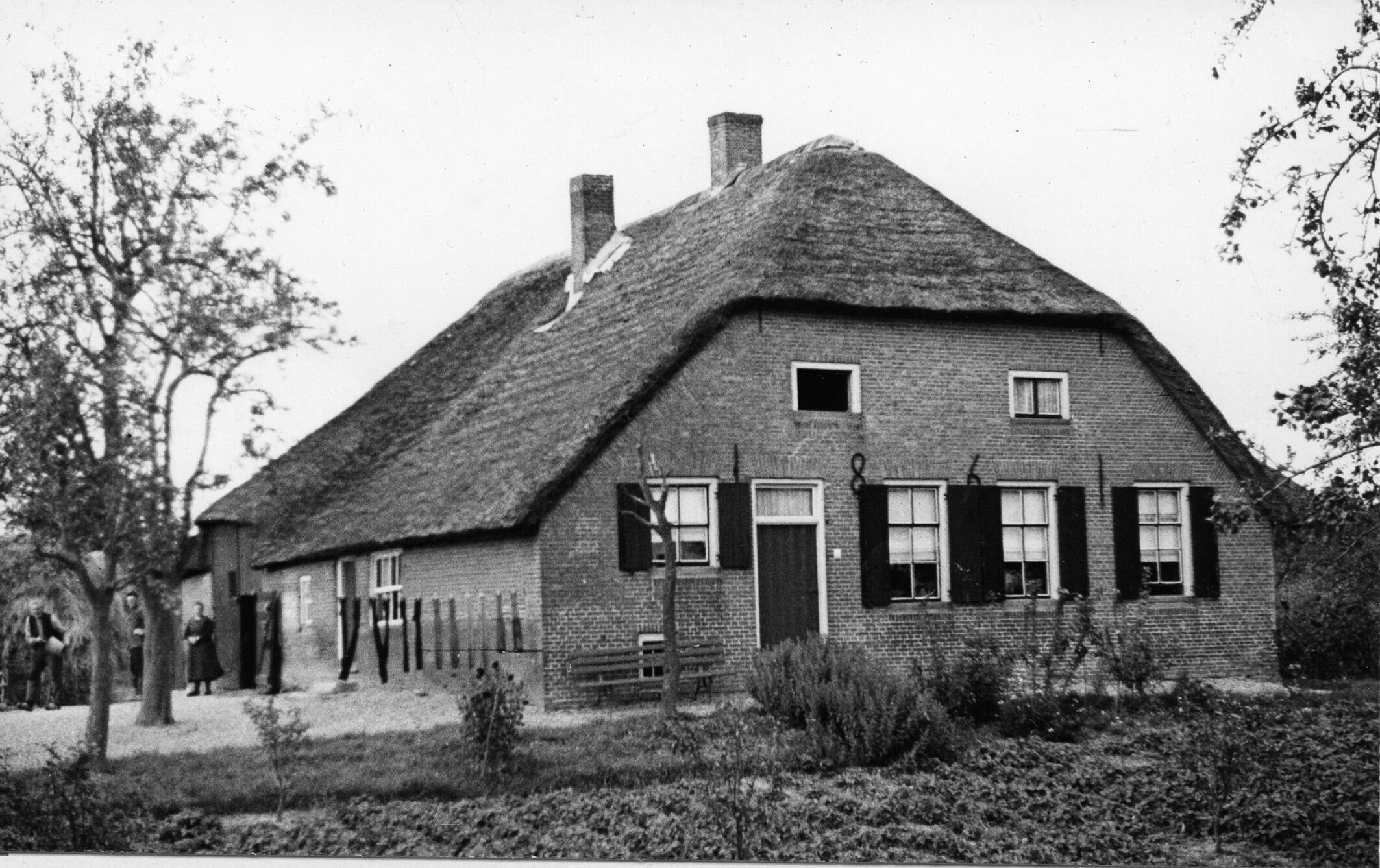 Hallenhuisboerderij in het Gelderse Well, met links twee mannen en een vrouw. Voor de boerderij ligt een moestuin. Muurankers op de voorgevel vormen het jaartal 1861.