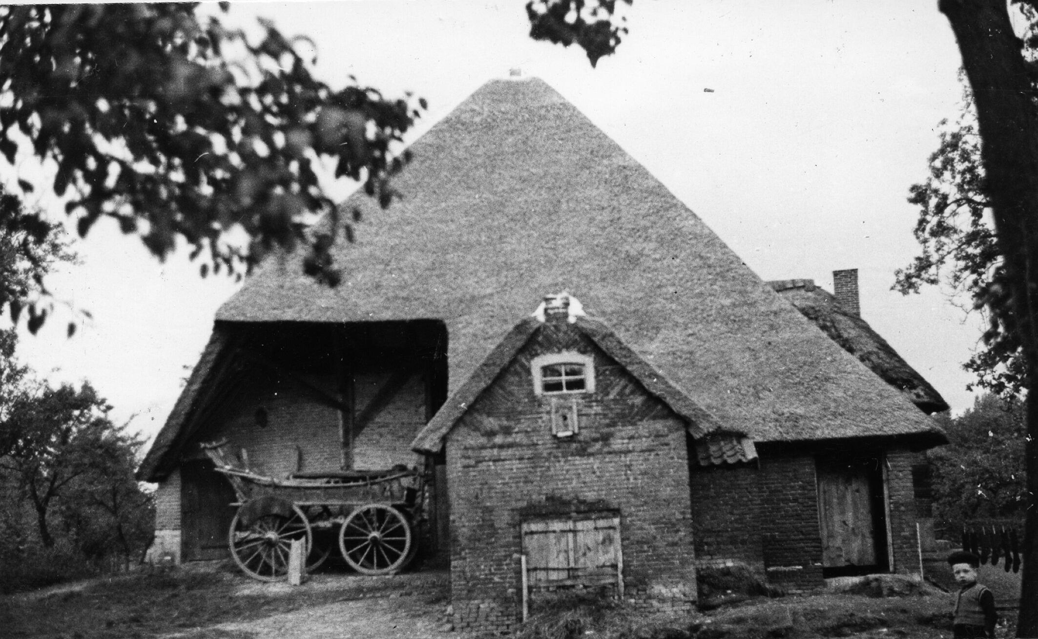 Achtergevel van een boerderij met overstek en kleine aanbouw in het Gelderse Kerkwijk, in de Bommelerwaard. Onder de overstek staat een boerenwagen. Rechts staat een jongen.
