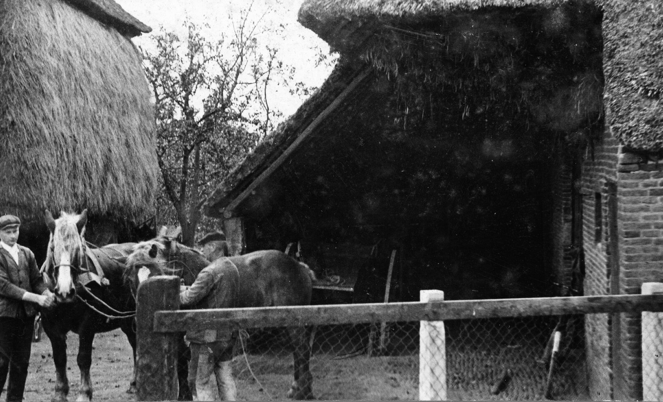 Achtergevel met een overstek van een boerderij in het Gelderse Aalst, nabij Zaltbommel. Links is een hooiberg. Op de voorgrond staan twee mannen en twee paarden.