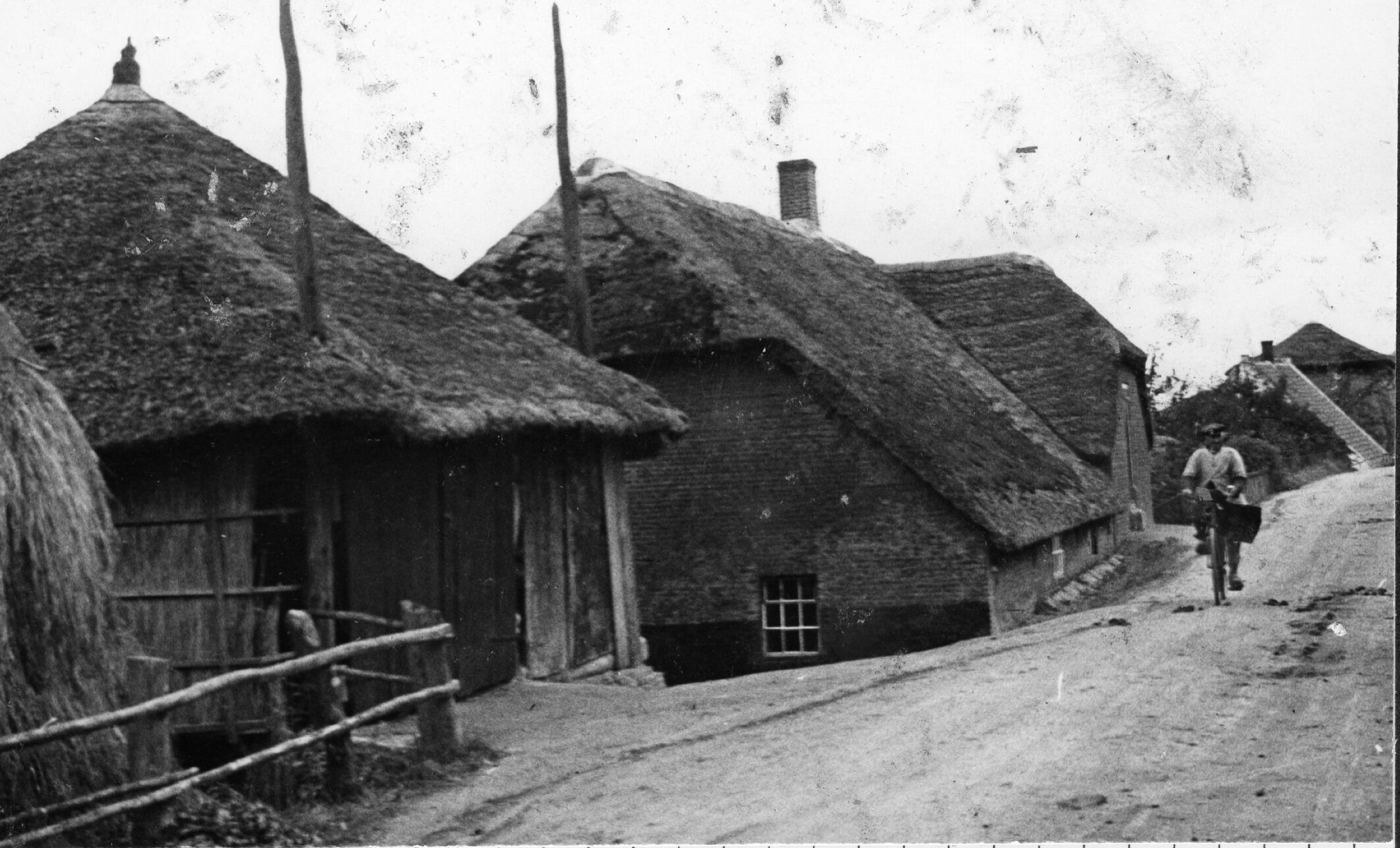 Hooiberg en boerderijen langs de Maasdijk in het Gelderse Wellseind. Op de zandweg fietst een man.