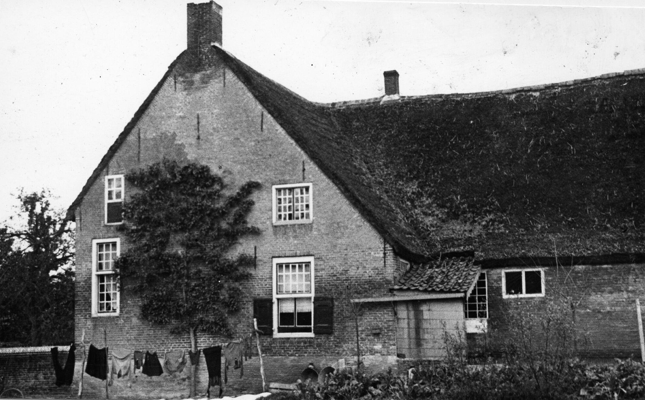 Het dwarshuis van een T-boerderij in het Gelderse Brakel, in de Bommelerwaard. Voor de boerderij hangt was aan een waslijn. Daarnaast is een moestuin.